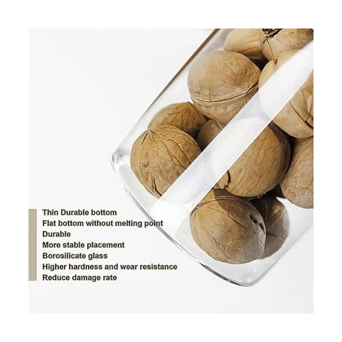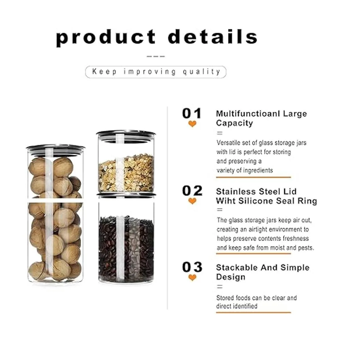 Tarros de almacenamiento de cristal de calidad prémium: este tarro de vidrio para alimentos de cocina está hecho de material de vidrio de borosilicato de alto grado que te permite almacenar tus alimentos en un recipiente para ocultar alimentos de forma segura y fresca. Organiza y despeja fácilmente tu encimera de cocina y armarios con este juego de 3 botes de cristal con tapas de acero inoxidable.