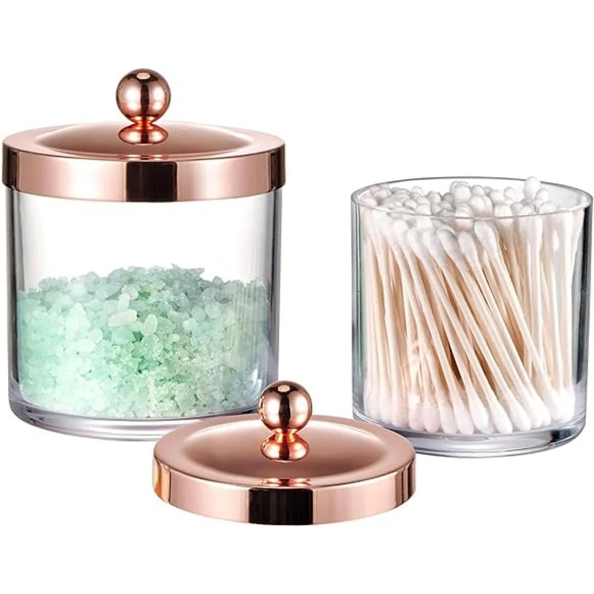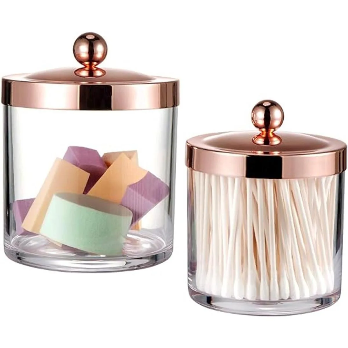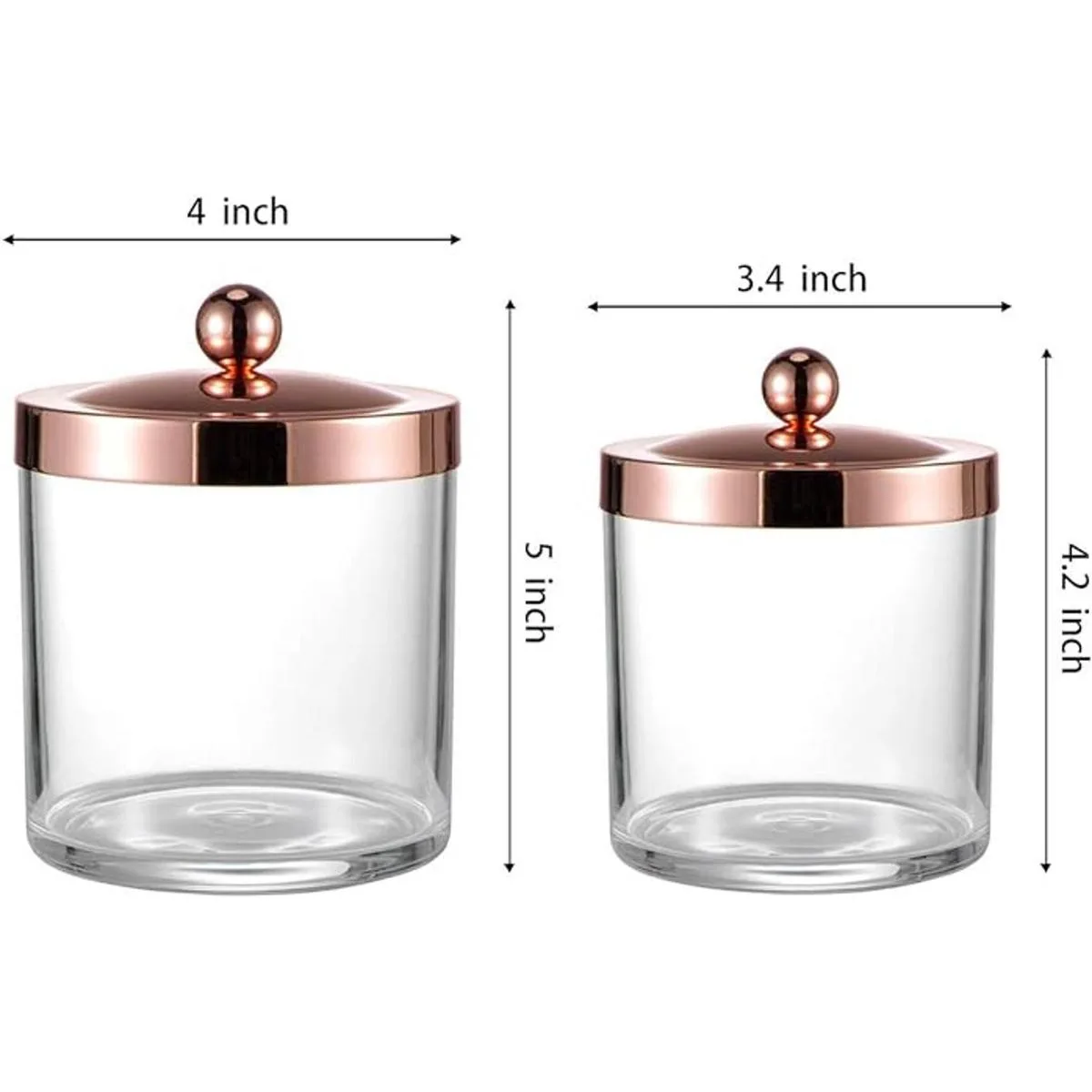 Tarros de boticario de plástico de alta calidad, soporte Qtip para tocador de baño, contenedor organizador de almacenamiento de encimera de acrílico transparente para hisopos de algodón, redondos, bolas, esponjas de maquillaje, sales de baño, paquete de 2 oro rosa