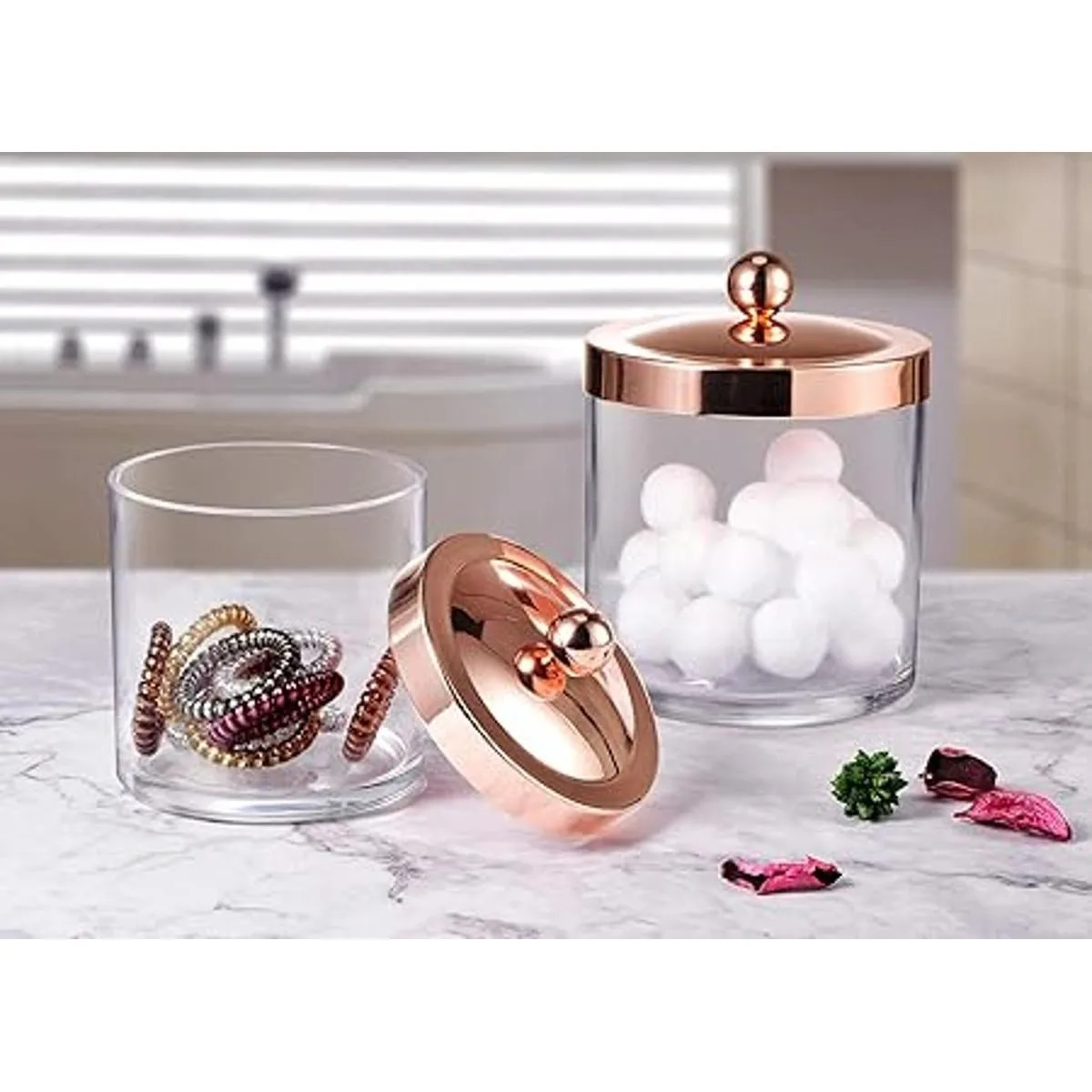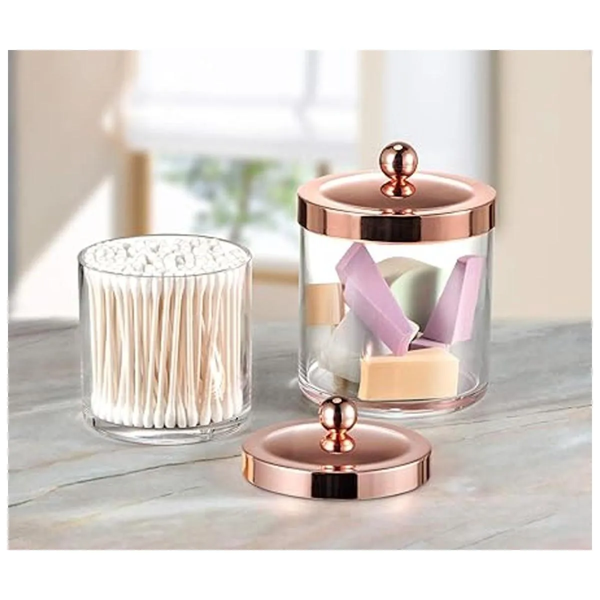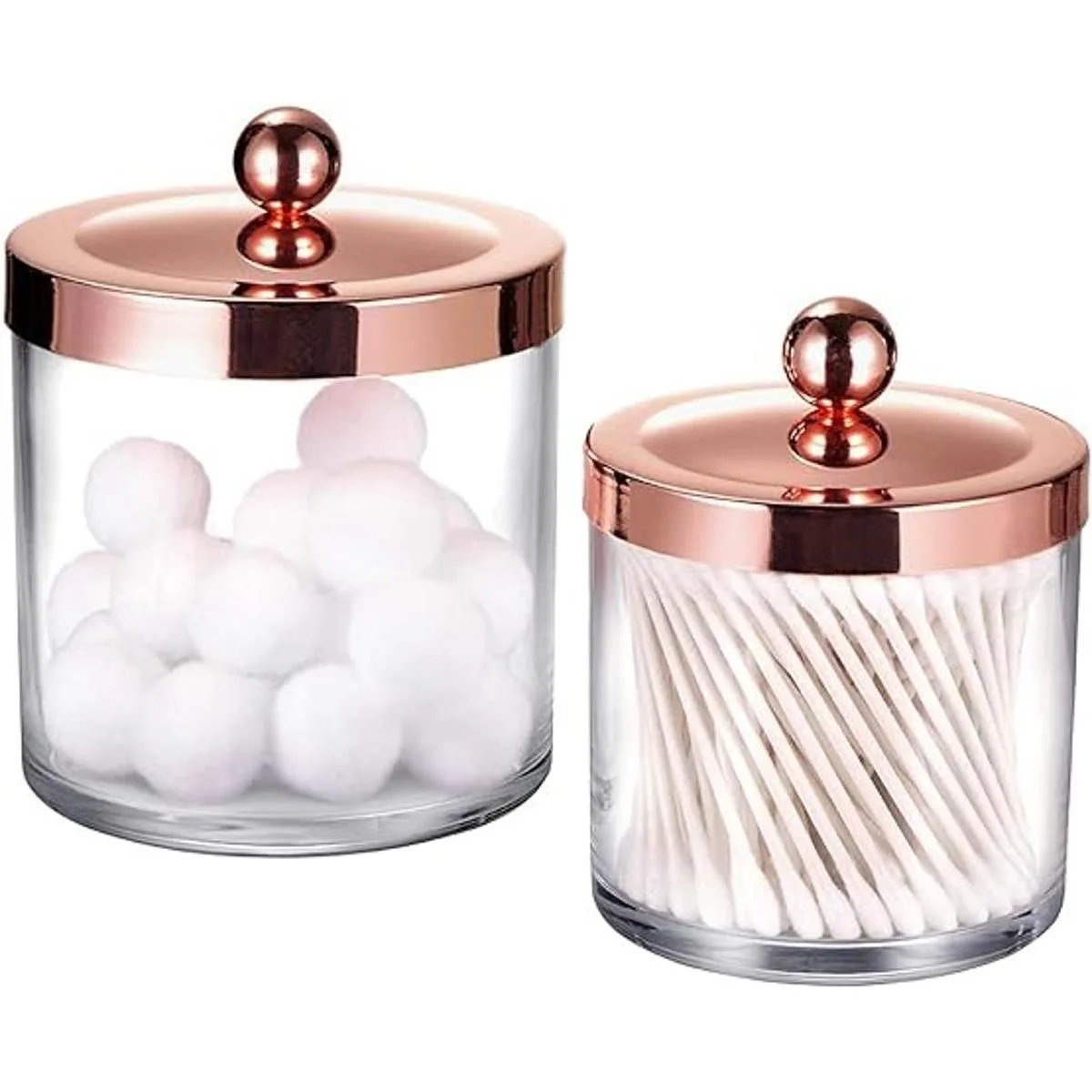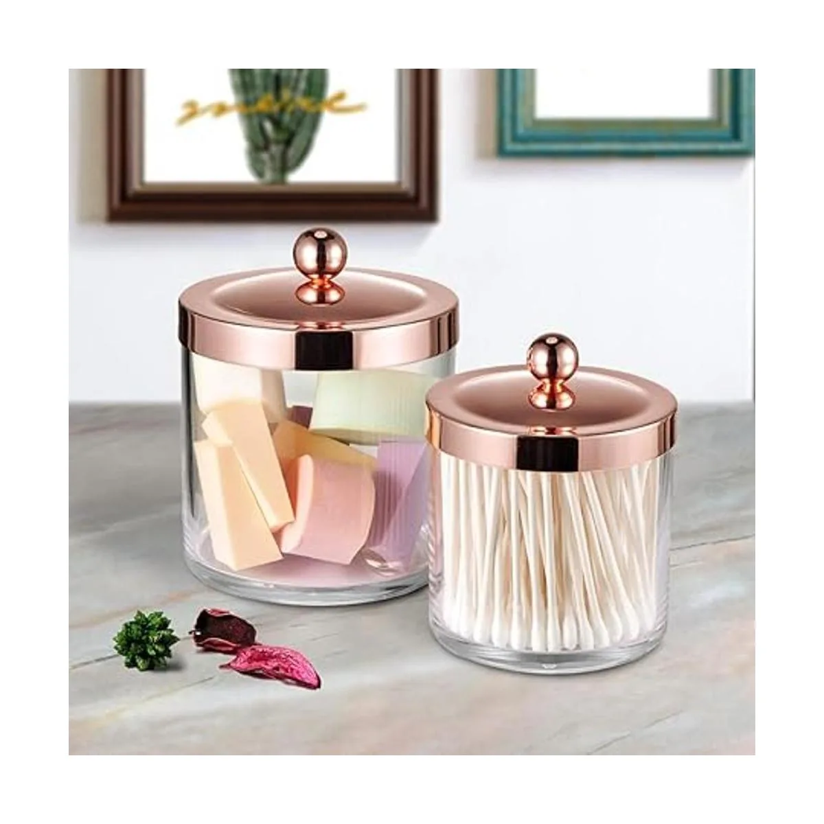 Tarros de boticario de plástico de alta calidad, soporte Qtip para tocador de baño, contenedor organizador de almacenamiento de encimera de acrílico transparente para hisopos de algodón, redondos, bolas, esponjas de maquillaje, sales de baño, paquete de 2 oro rosa