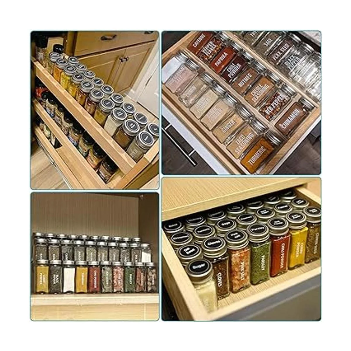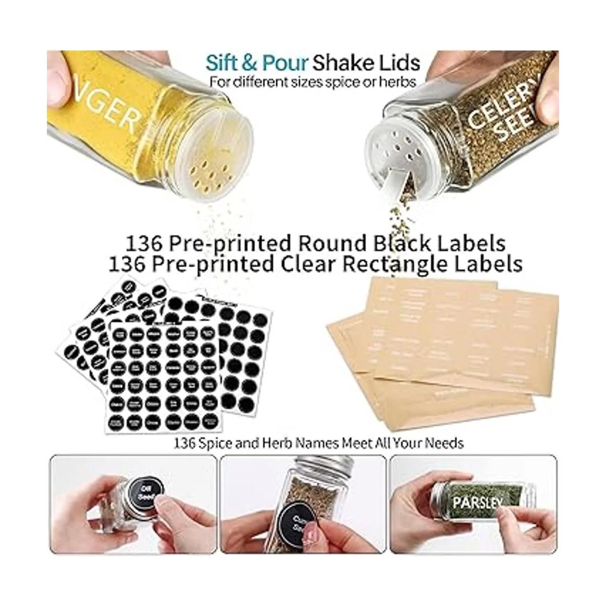 Diseño de etiqueta preimpresa de 2 tipos para ver y agarrar fácilmente. Etiqueta preimpresa redonda negra en la parte superior de la tapa para una vista desde arriba. Etiqueta cuadrada transparente en el cuerpo de la botella para tumbarse plano. 2 etiquetas en un tarro de especias fácil de desnatar e identificar su contenido localiza el condimento que necesitas. No hay rebuscar las especias mientras cocinas. Mejora tu experiencia de cocina.