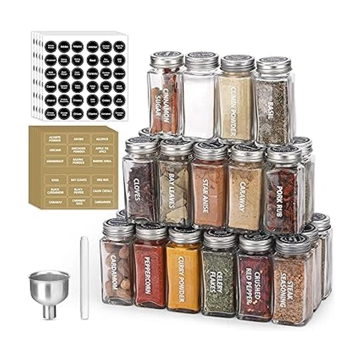 Juego completo de botellas de especias 28 tarros vacíos de especias de vidrio de 3.5 onzas, 28 tapas de coctelera las tapas de tamizado y vertido te permiten agitar o medir con cucharas. 28 tapas herméticas de aluminio inoxidables que mantienen tus especias frescas durante más tiempo. 288 etiquetas impermeables preimpresas para tarros de especias. 144 nombres de especias y hierbas para satisfacer todas tus necesidades, 36 etiquetas en blanco con 1 marcador blanco para bricolaje, 1 embudo de acero inoxidable hace que añadir transferencia de especias sea sin desorden, simplificando la tarea de recarga