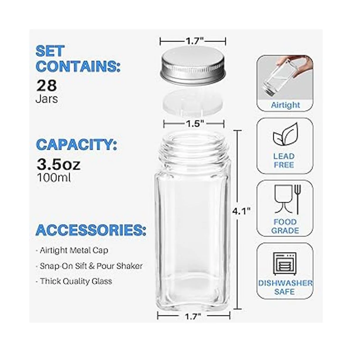 Tarros de especias, paquete de 28 tarros de especias de vidrio ultra transparente de 3.5 onzas con 324 etiquetas, tapas de coctelera y tapas de metal herméticas, tarros de botellas de almacenamiento de condimentos cuadrados reutilizables vacíos