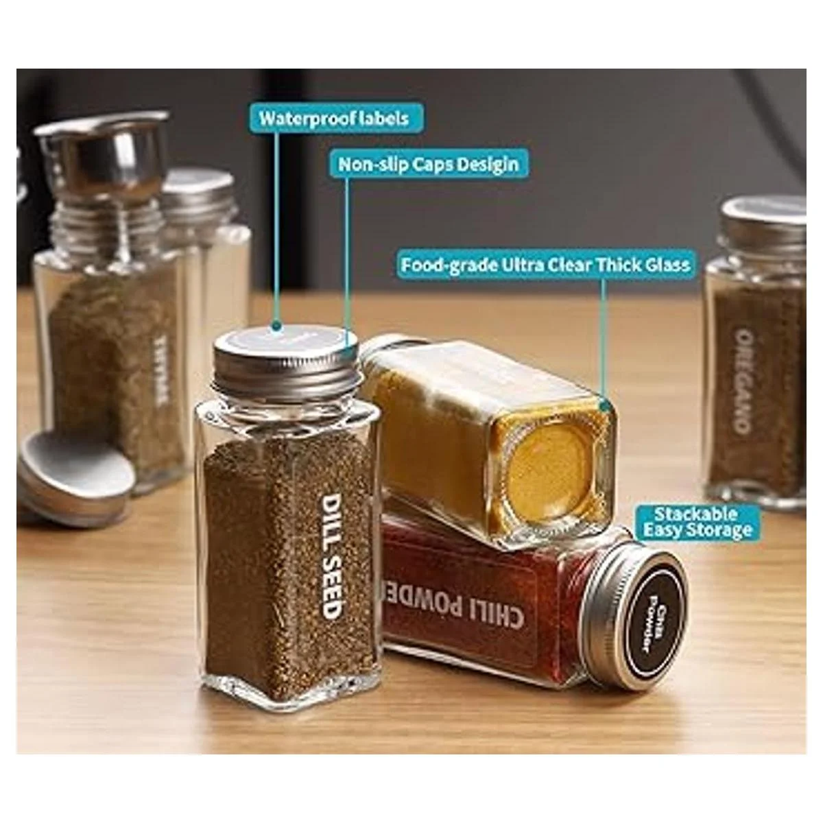 Vidrio ultra transparente de grado alimenticio: tarros de especias hechos de vidrio duradero sin plomo. Apto para lavavajillas. Hermeticidad. Paquete de 28 unidades. Mide aproximadamente 4 pulgadas de alto x 13/4 pulgadas de ancho con 11/4 pulgadas de diámetro interior de apertura. Las formas cuadradas de la botella no se enrollan. Se pueden utilizar en especieros, armarios, despensas, organizadores, cajones, encimeras, etc.