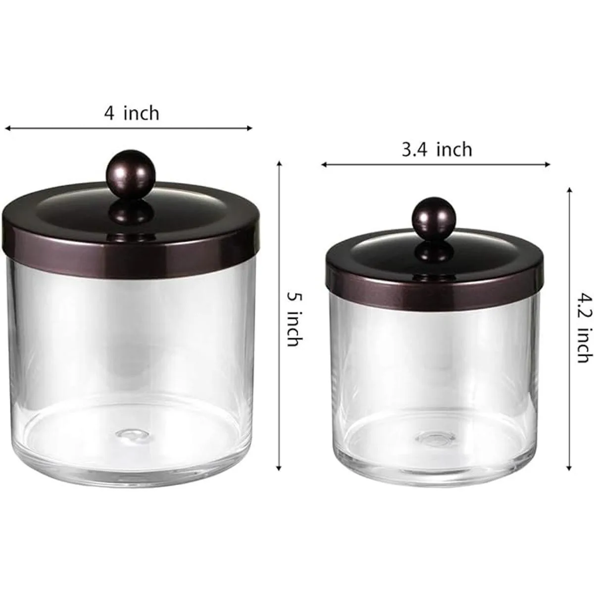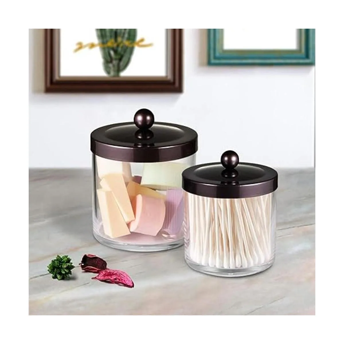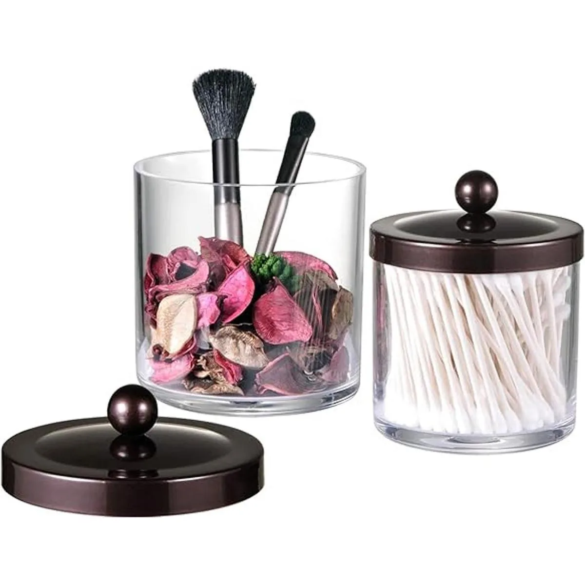 Tarros de plástico de alta calidad para boticario Soporte Qtip para tocador de baño, organizador de almacenamiento de encimera de baño, acrílico transparente para hisopos de algodón, redondos, bolas, esponjas de maquillaje, sales de baño, paquete de 2 bronce