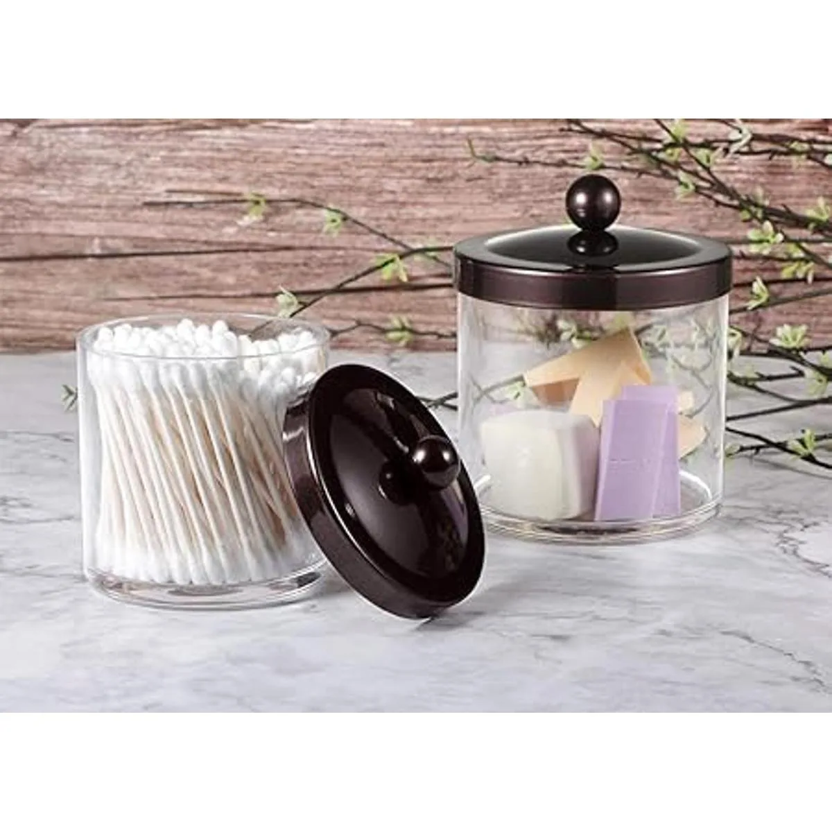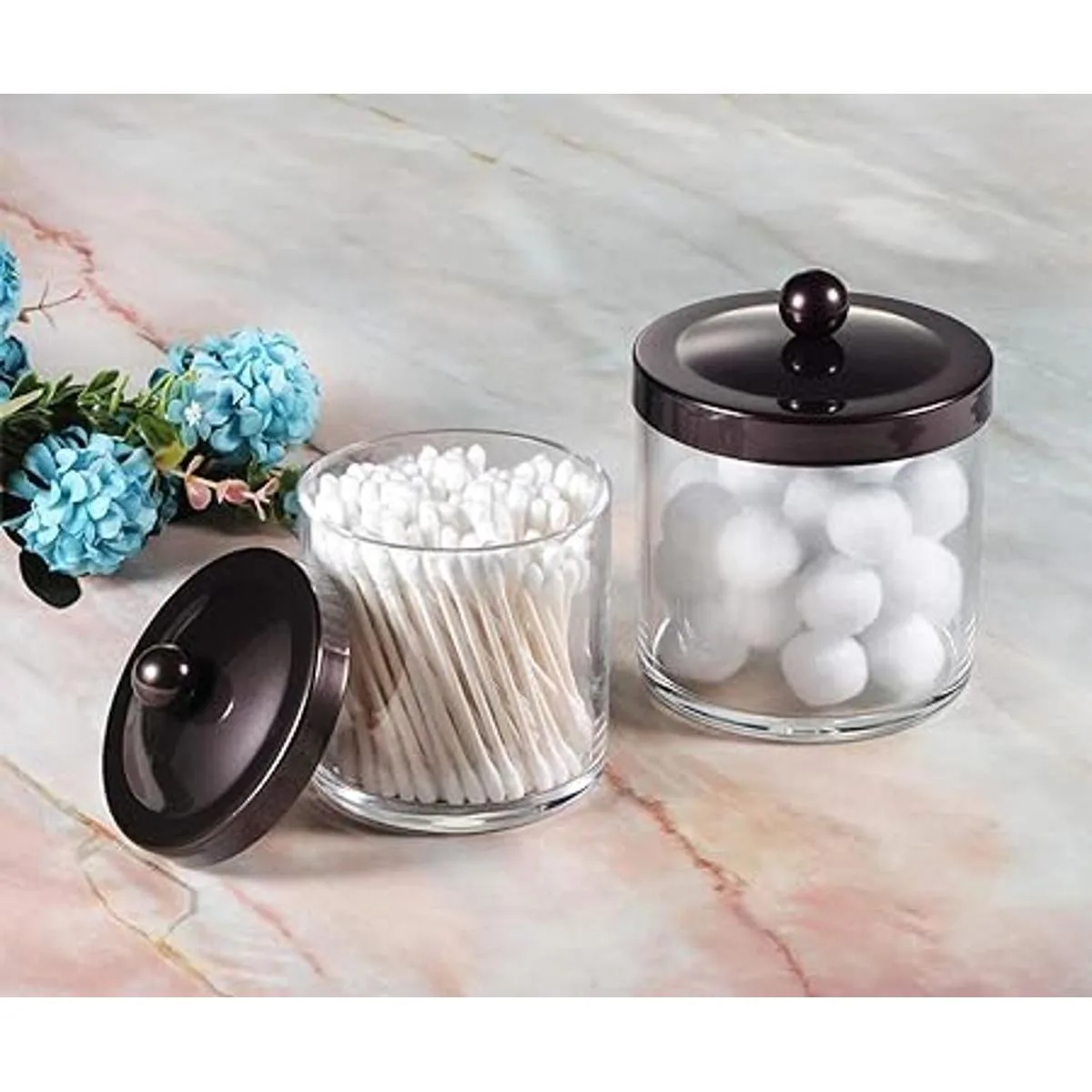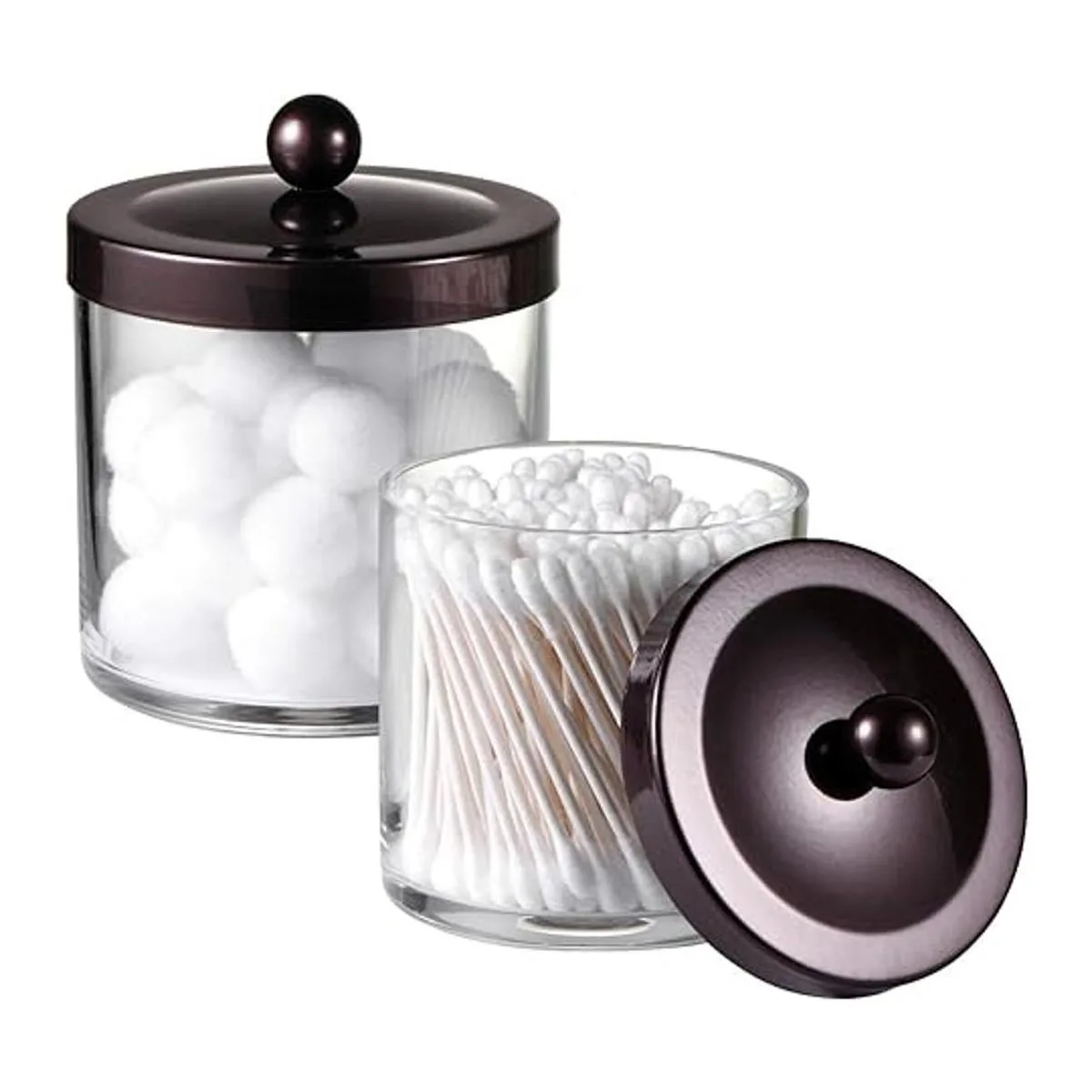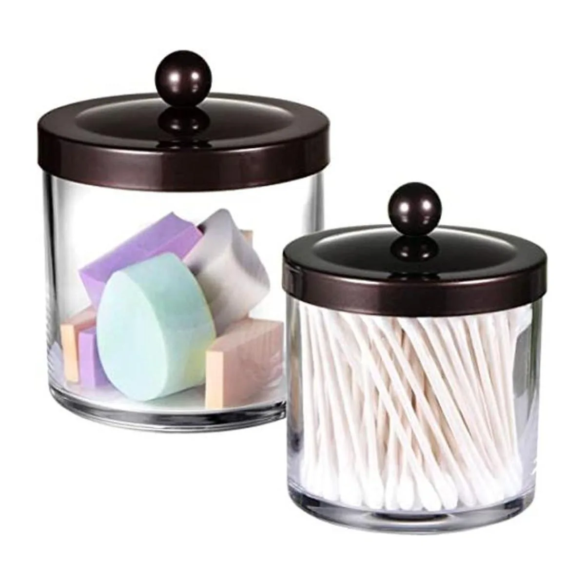 Tarros de plástico de alta calidad para boticario Soporte Qtip para tocador de baño, organizador de almacenamiento de encimera de baño, acrílico transparente para hisopos de algodón, redondos, bolas, esponjas de maquillaje, sales de baño, paquete de 2 bronce