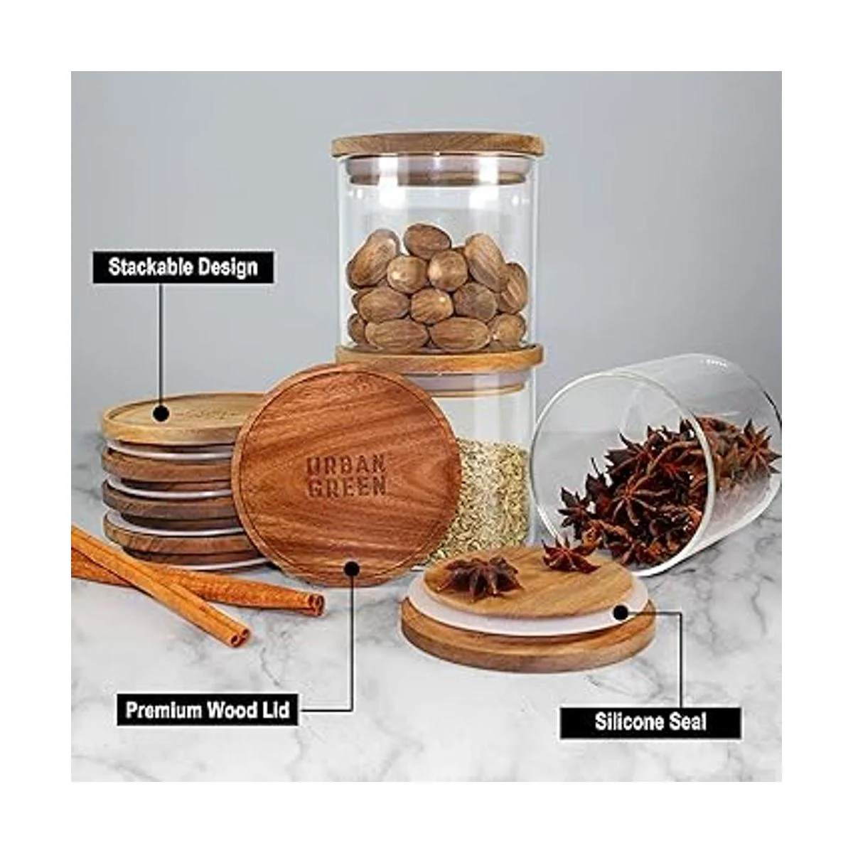 Cristal de borosilicato de alta calidad y tapa de madera: los recipientes de vidrio Urban Green están hechos de vidrio de borosilicato de alta calidad con tapas de madera pulidas suaves y hermosamente finas en juego de 2 paquetes grandes. Nuestras tapas de madera están hechas de madera de acacia, son fuertes, duraderas y de aspecto clásico. El vidrio transparente no reactivo resiste las manchas, los amantes de los alimentos, no es poroso, libre de gérmenes o incluso olores que se filtran en tus recipientes de vidrio. Haz que los productos saludables sean parte de tu vida cotidiana