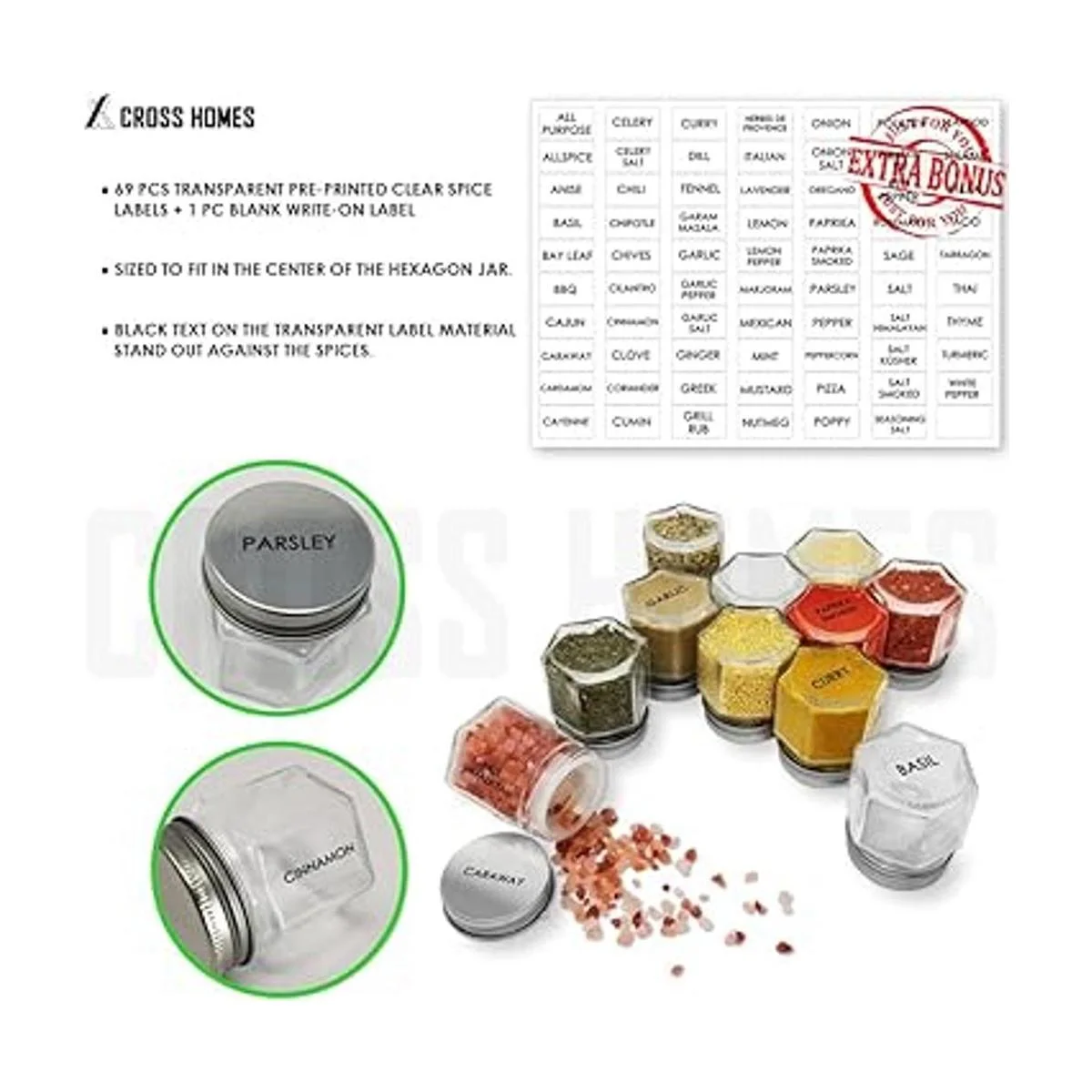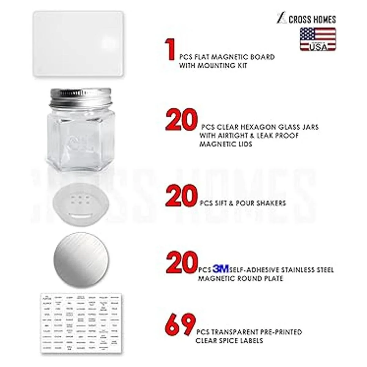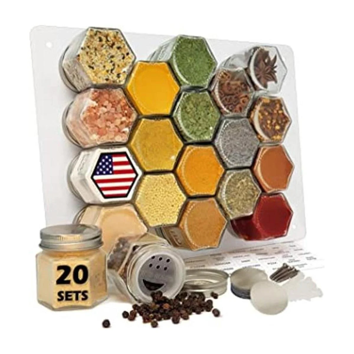 Juego completo de 20 tarros de especias hexagonales pequeños para crear un estante de especias colgante de bricolaje en tu propio refrigerador, refrigerador, armario y montaje en pared: 20 juegos completos que incluyen 20 tarros de vidrio hexagonales transparentes con tapas magnéticas herméticas y a prueba de fugas 20 agitadores 1 unidad. Pizarra magnética 20 placas redondas magnéticas autoadhesivas de acero inoxidable 69 etiquetas de especias preimpresas incluidas.