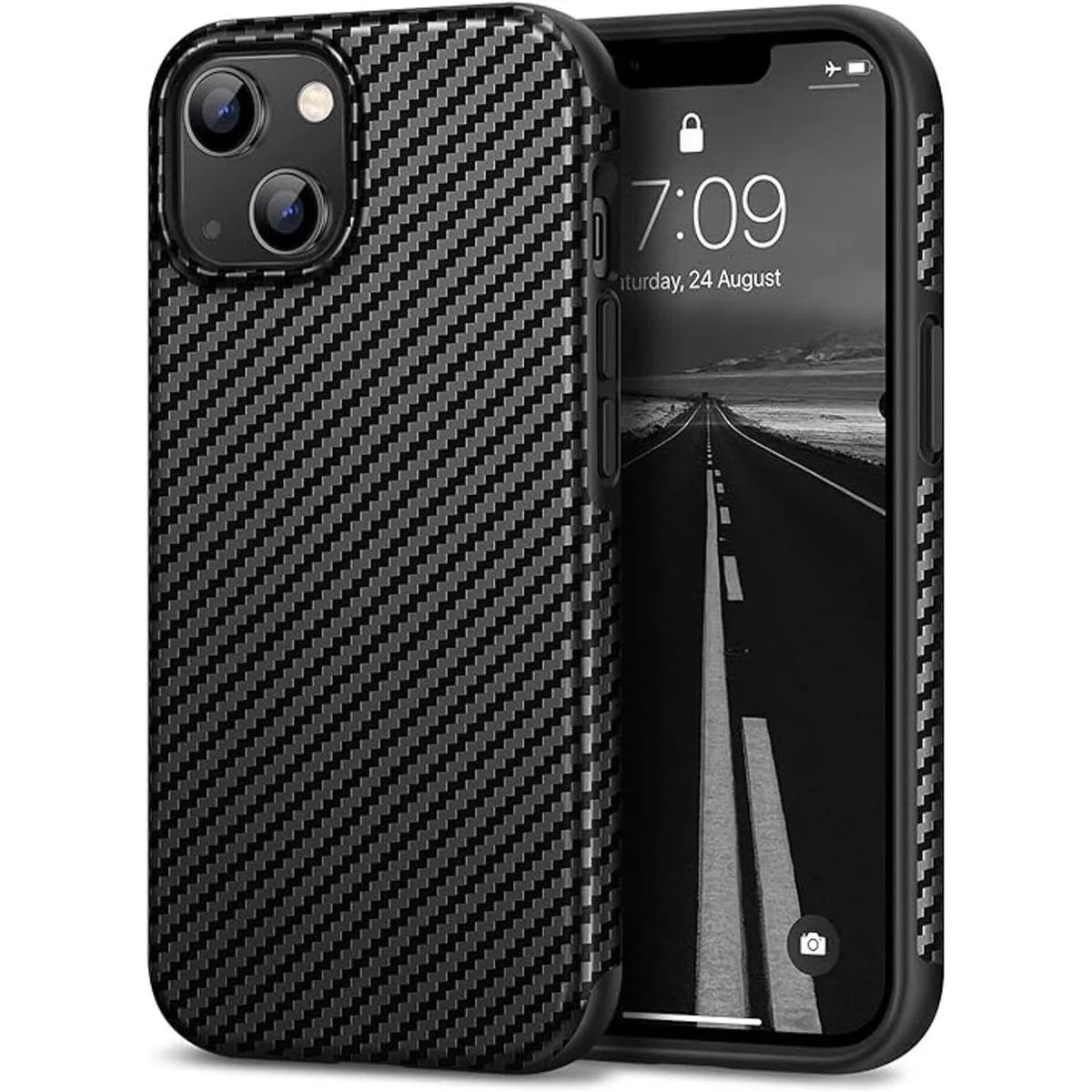 Tasikar Funda compatible con iPhone 14, textura de piel de fibra de carbono con funda protectora delgada de poliuretano termoplástico, color negro