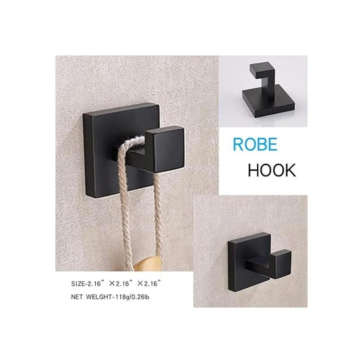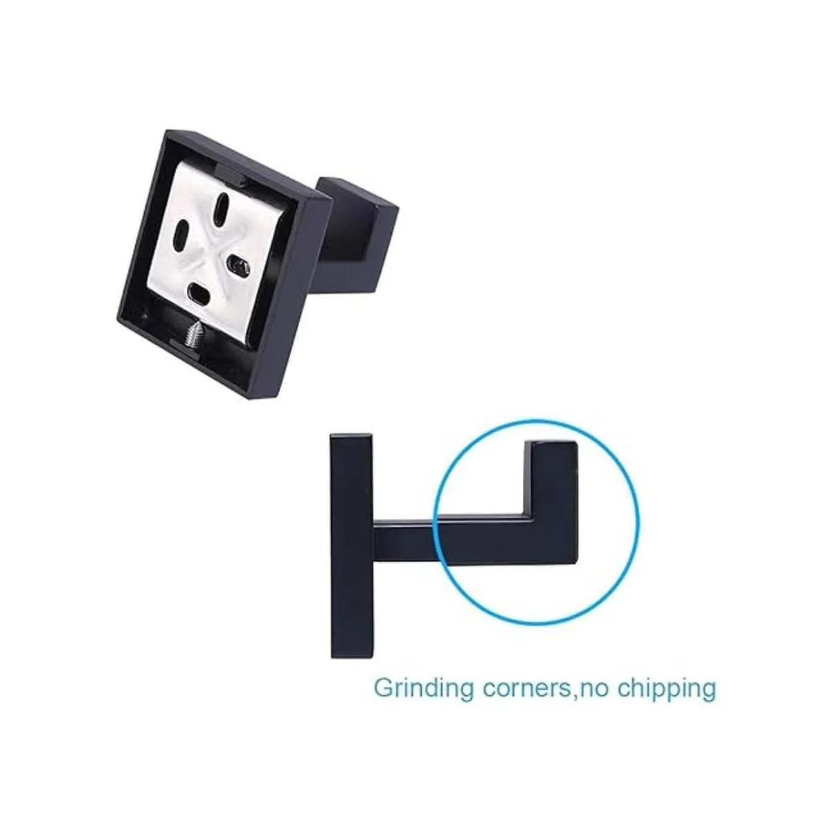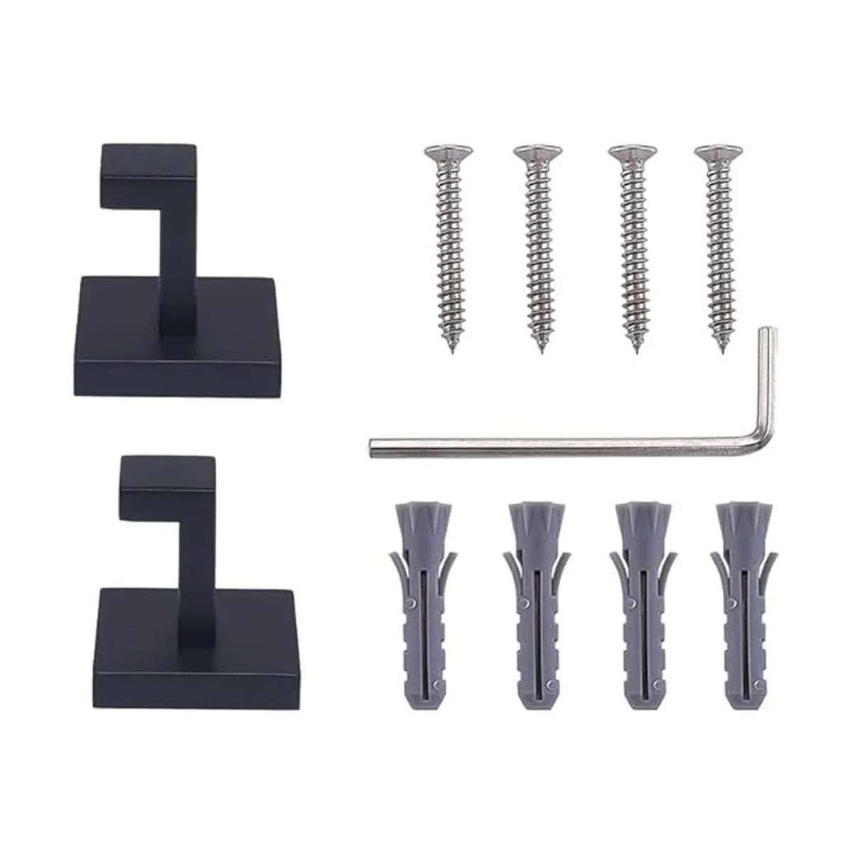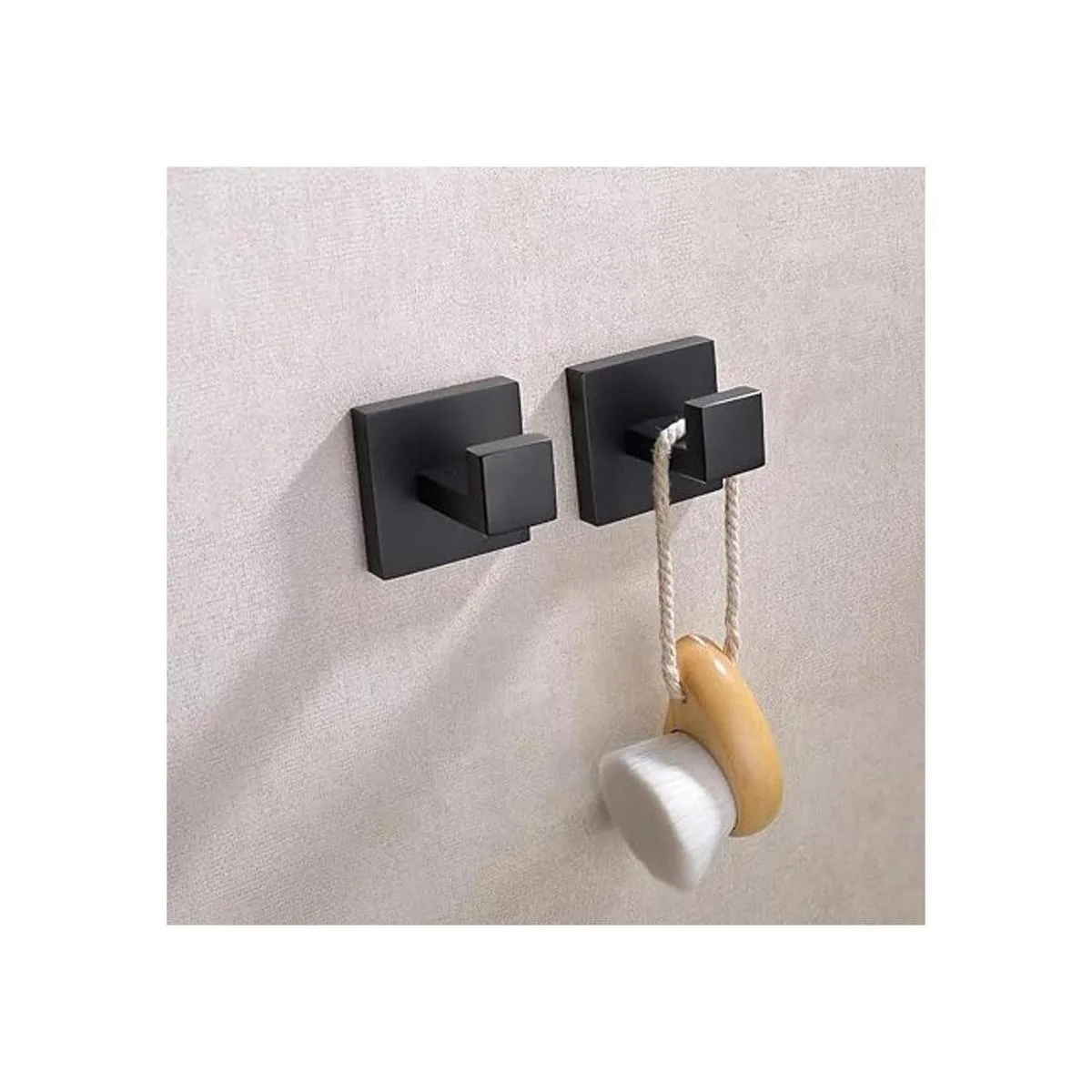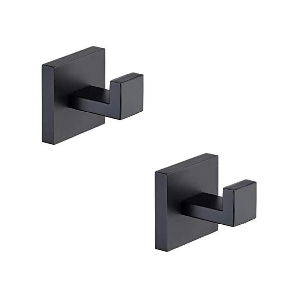TASTOS Ganchos para toallas de baño, color negro mate, paquete de 2 ganchos de acero inoxidable para bata y ropa, gancho de pared resistente para baño y cocina, estilo cuadrado moderno montado en la pared negro