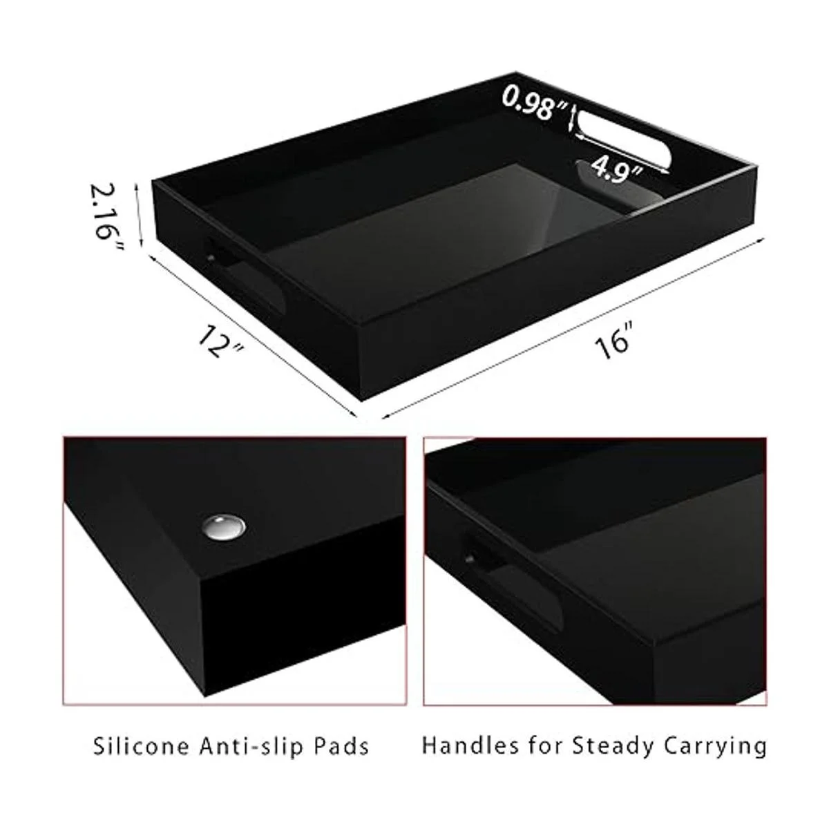 Bandeja de acrílico negro: hecha de acrílico de 0.197 in de grosor, el diseño de borde liso para un uso más seguro, duradero y práctico; la forma rectangular y el diseño negro dan a esta bandeja acrílica un aspecto elegante, moderno y llamativo.