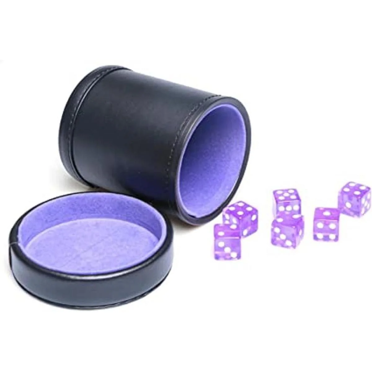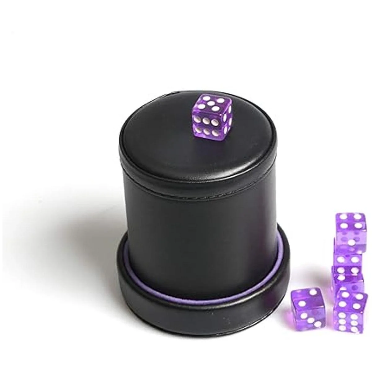 Un gran juego de dados con tapa y seis dados morados adicionales de 0.630 in, perfecto para Farkle, Yahtzee, Liars Dice u otros juegos de dados donde la taza está girada y oculta.