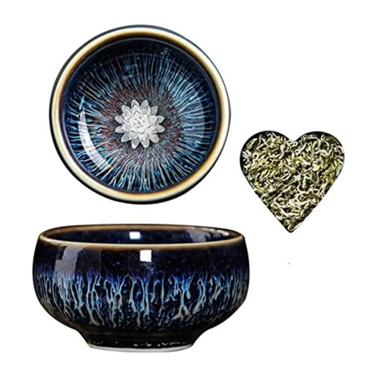 Taza de té de loto plateado: la parte inferior de la taza de té de cerámica está incrustada con un loto plateado realista 3D, después de verter té, se ve más hermosa y noble. Beber té de loto jianzhan taza te hará sentir que el agua y el té están mezclados, dulces y suaves, llenos de té, sabor profundo y fragancia fuerte, y la fragancia está aumentando.