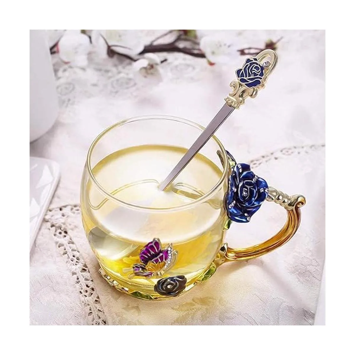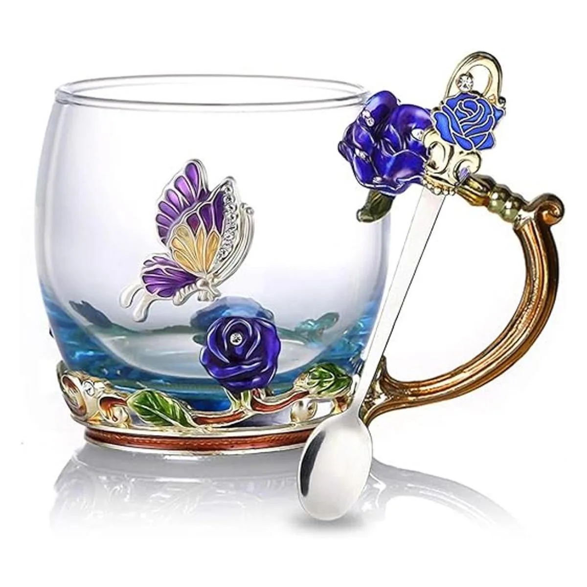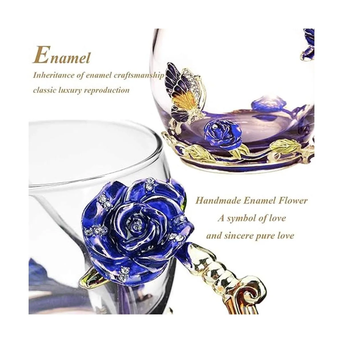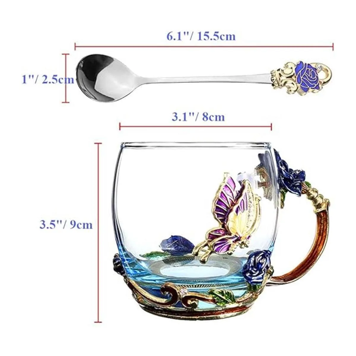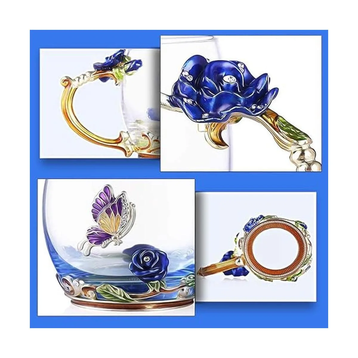 La taza más bonita: Has visto una taza de café de cristal más bonita Kaiyuan Dynasty te presenta la taza de cristal esmaltado hecha a mano con un estilo elegante con diseños de mariposas y rosas rojas en 3D, el material de la taza es brillante. Nunca se decolora con el paso del tiempo.