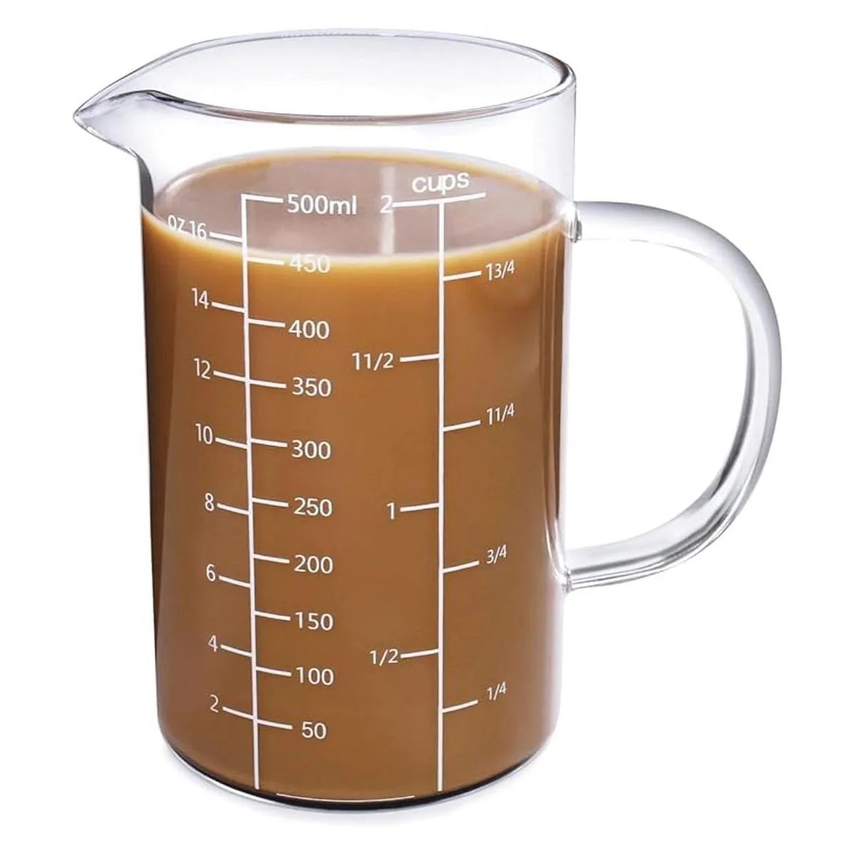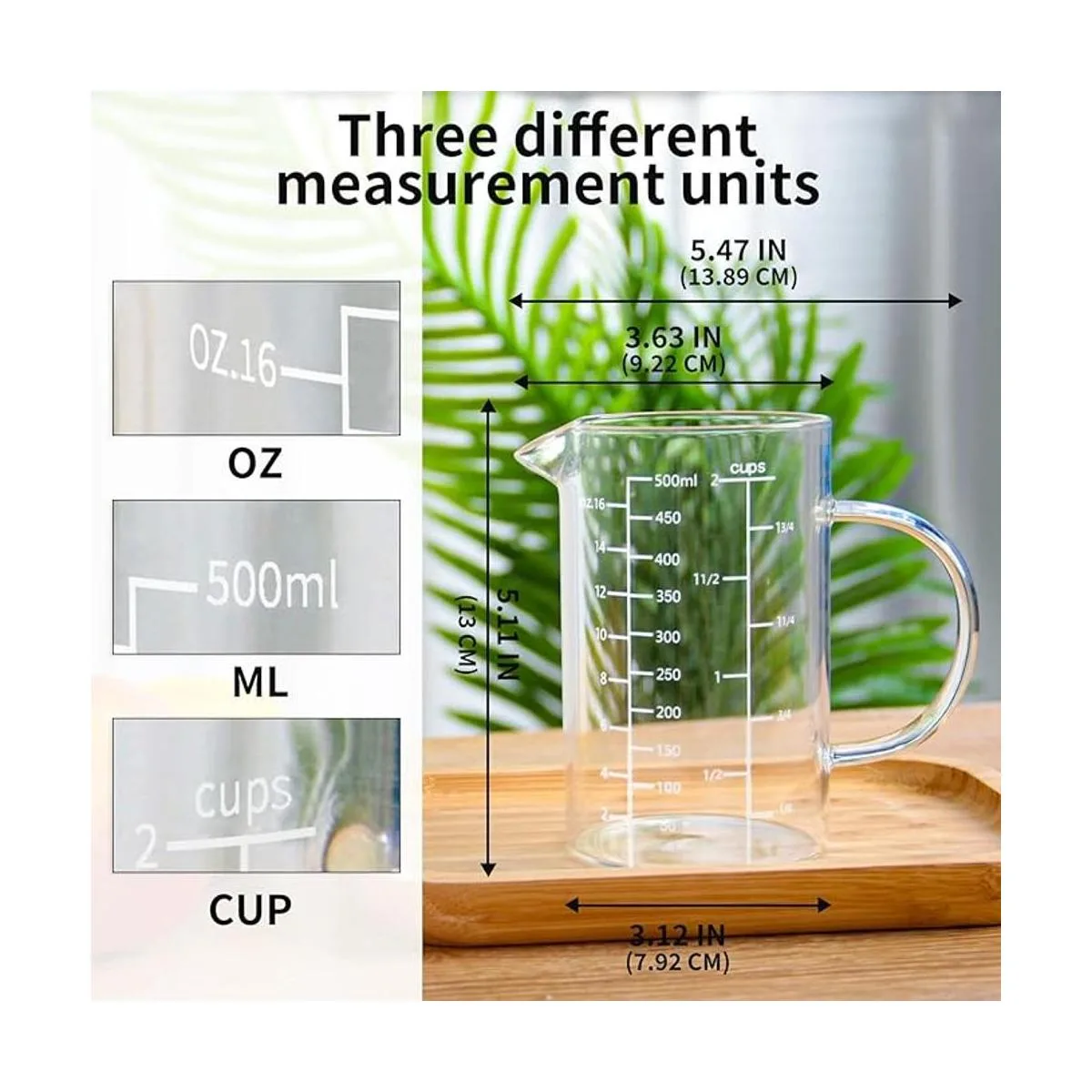 Taza medidora de vidrio, mango aislado, pico en forma de V, taza medidora de vidrio borosilicato de alta 77 L para cocina o restaurante, fácil de leer, 16.9 fl oz 0,5 litros, 2 tazas