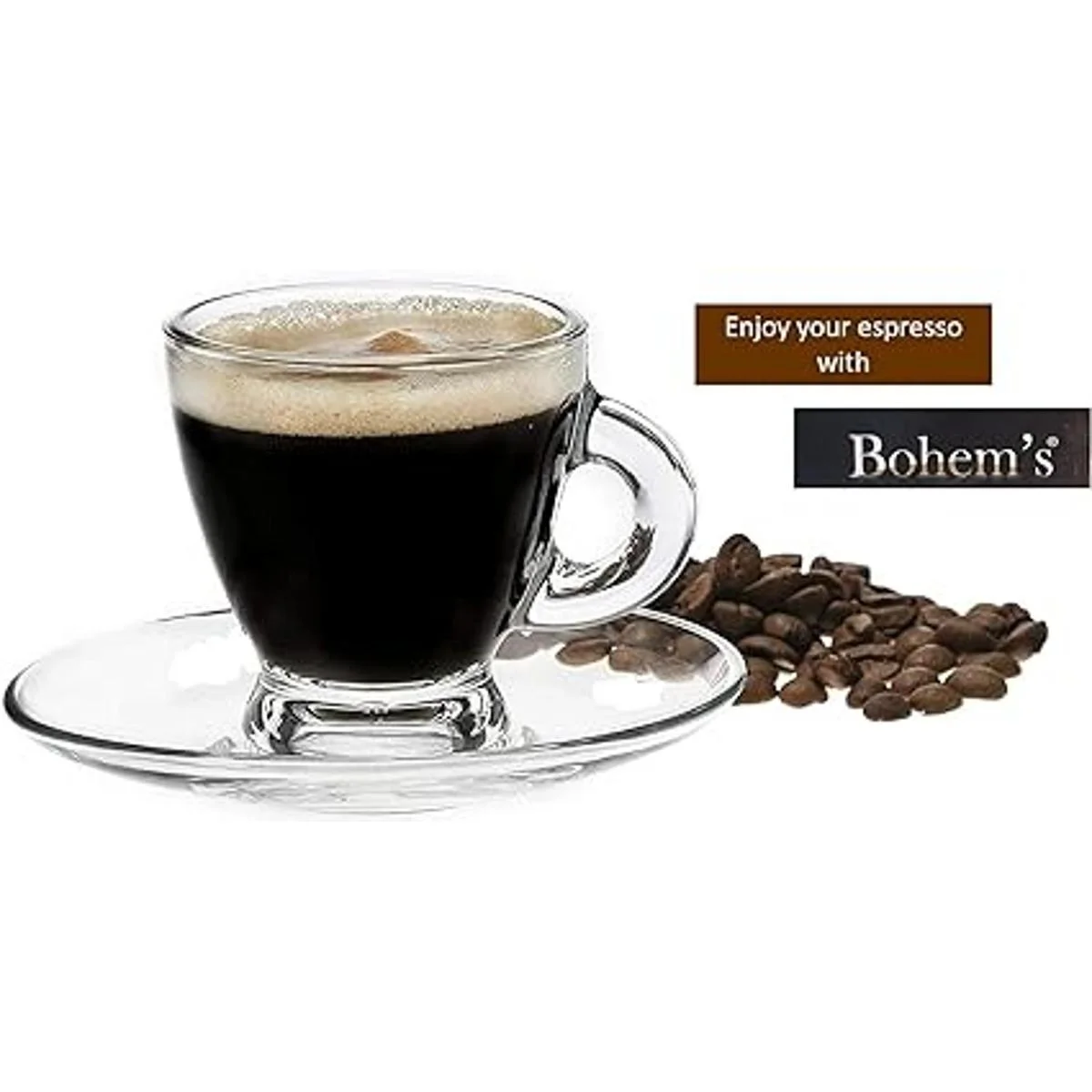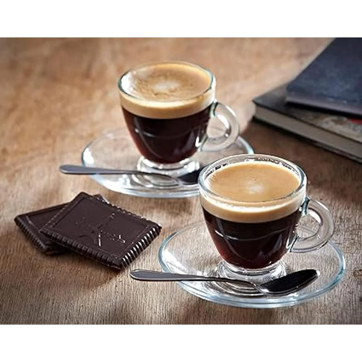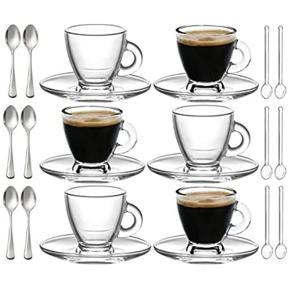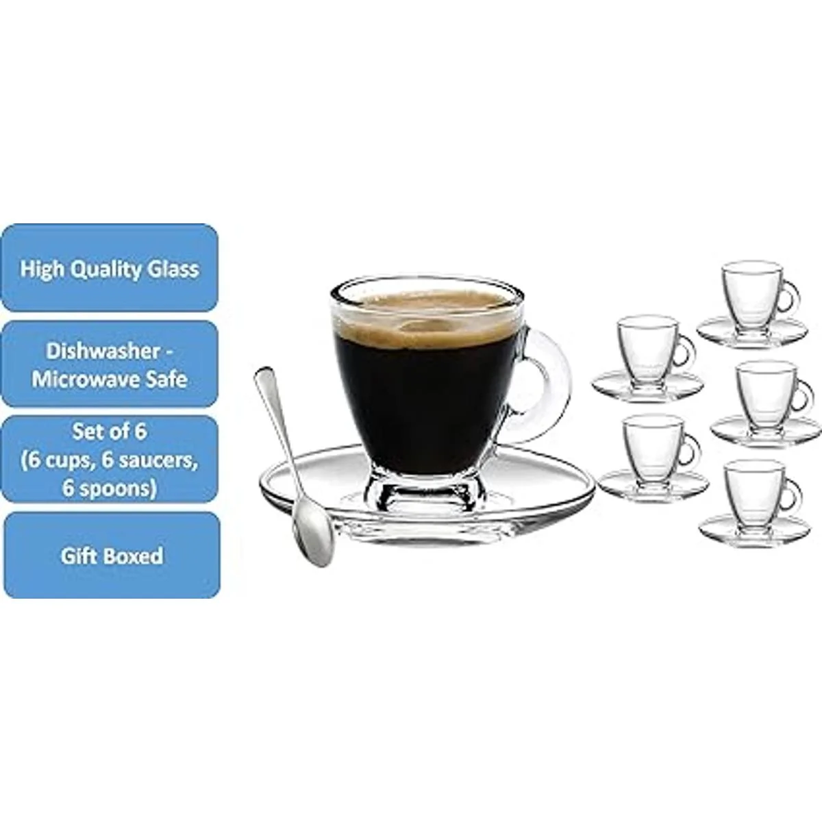 Lo que obtienes: 6 tazas de vidrio espresso, 6 platillos de vidrio sin condensación, por lo que no hay necesidad de posavasos. y 6 cucharas pequeñas de acero inoxidable. Mejora tu experiencia de indulgencia del café.