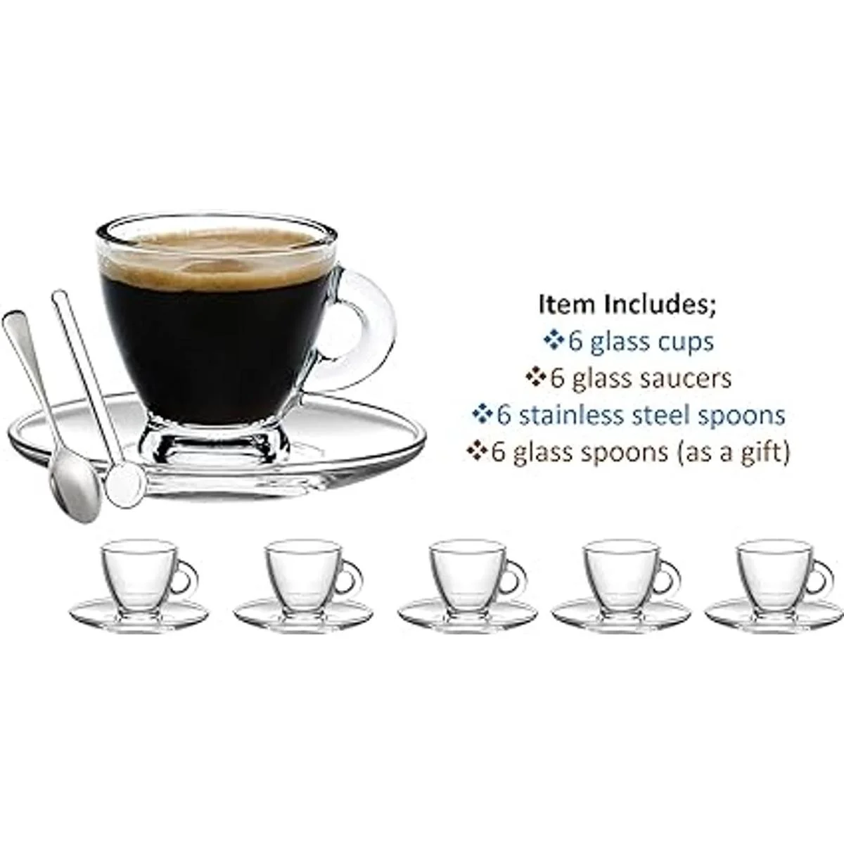Tazas de expreso, vasos de expreso de vidrio transparente de 3.2 onzas, juego de tazas, platillos y mini cucharas de acero inoxidable cucharas de vidrio gratis juego de 6