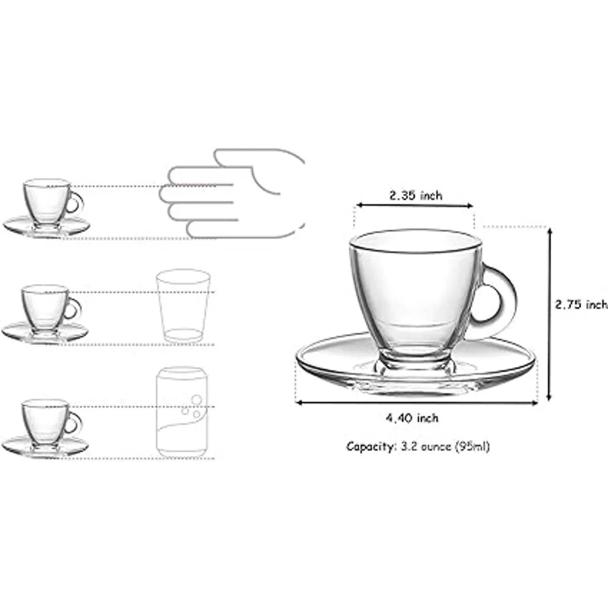 Capacidad: un generoso volumen de 3.2 onzas 3.2 fl oz es suficiente, una opción perfecta para espresso, té, postres. Las tazas de vidrio son del tamaño perfecto para la bebida espresso de tu elección; el mango es un tamaño cómodo para transportar tu café de mesa a boca.
