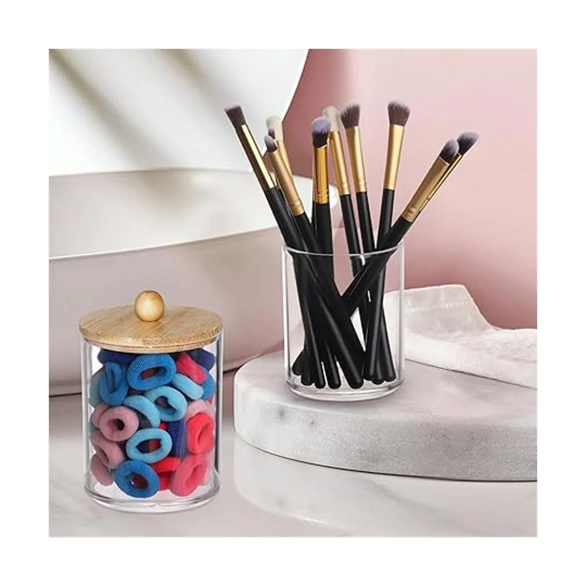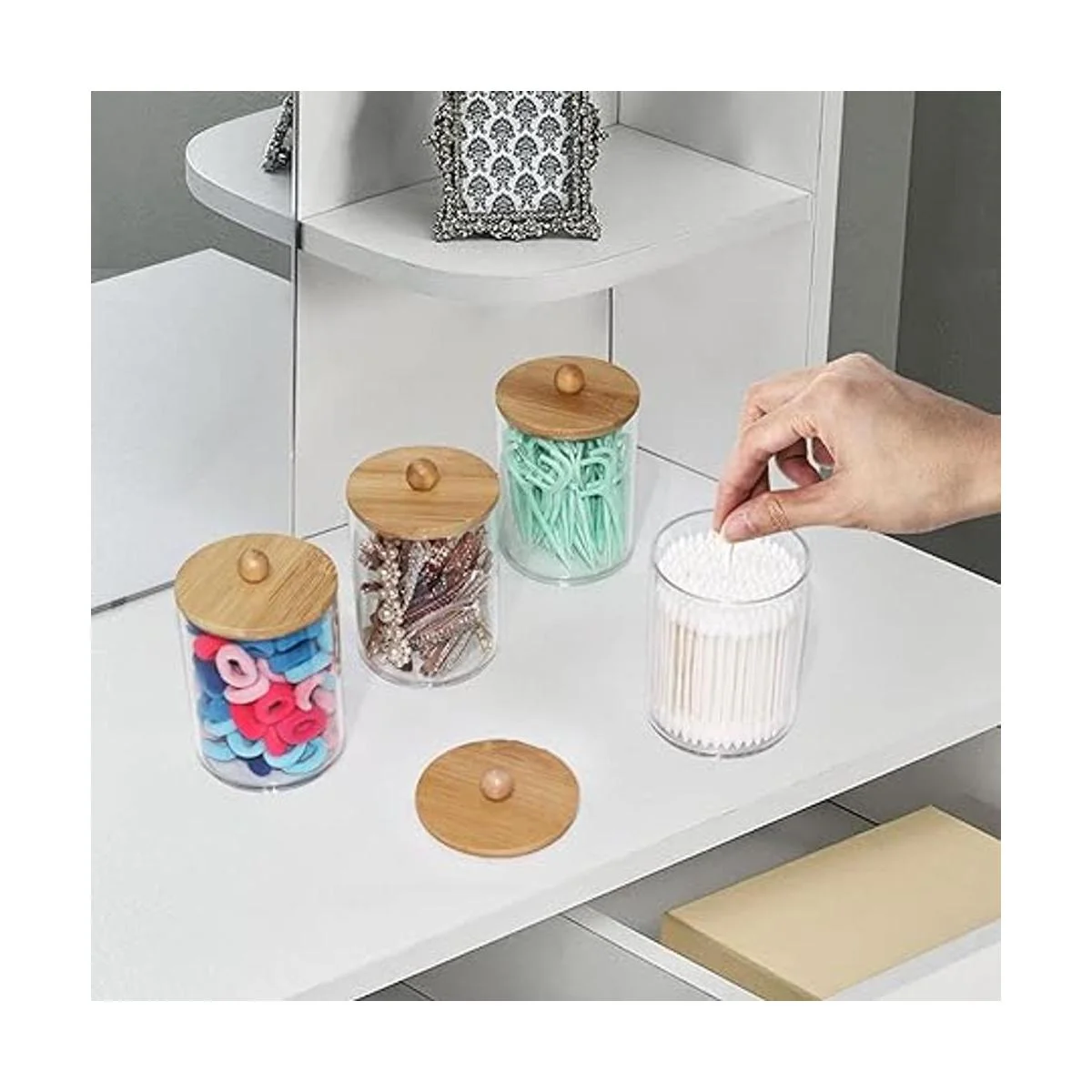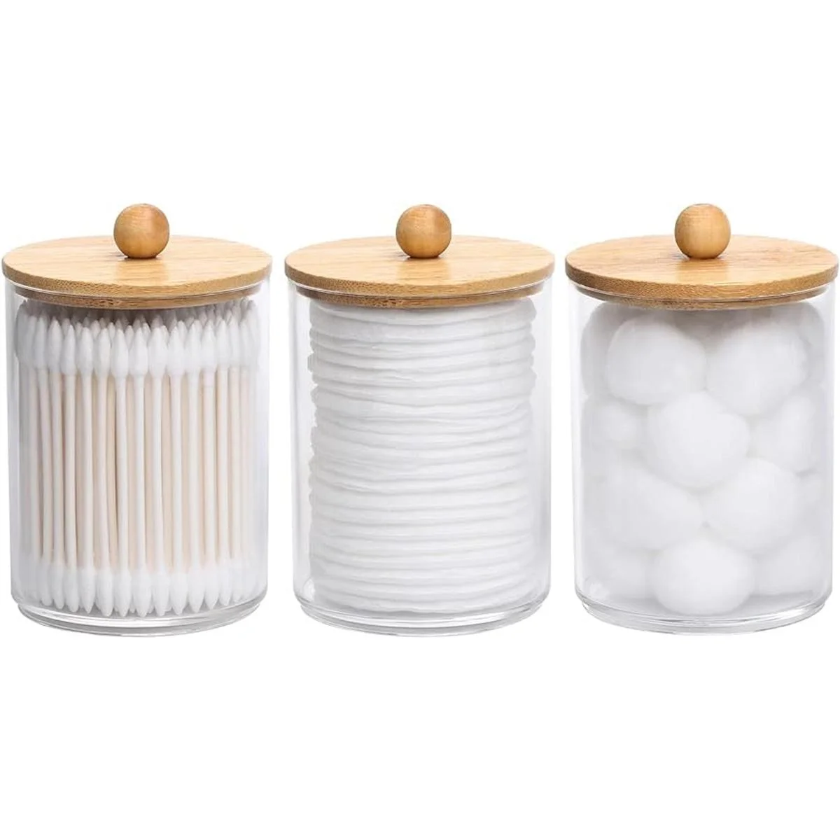 Tbestmax Soporte para hisopoboticario de algodón de 10 onzas, dispensador transparente de recipientes de baño para almacenamiento, paquete de 3 tapas de madera