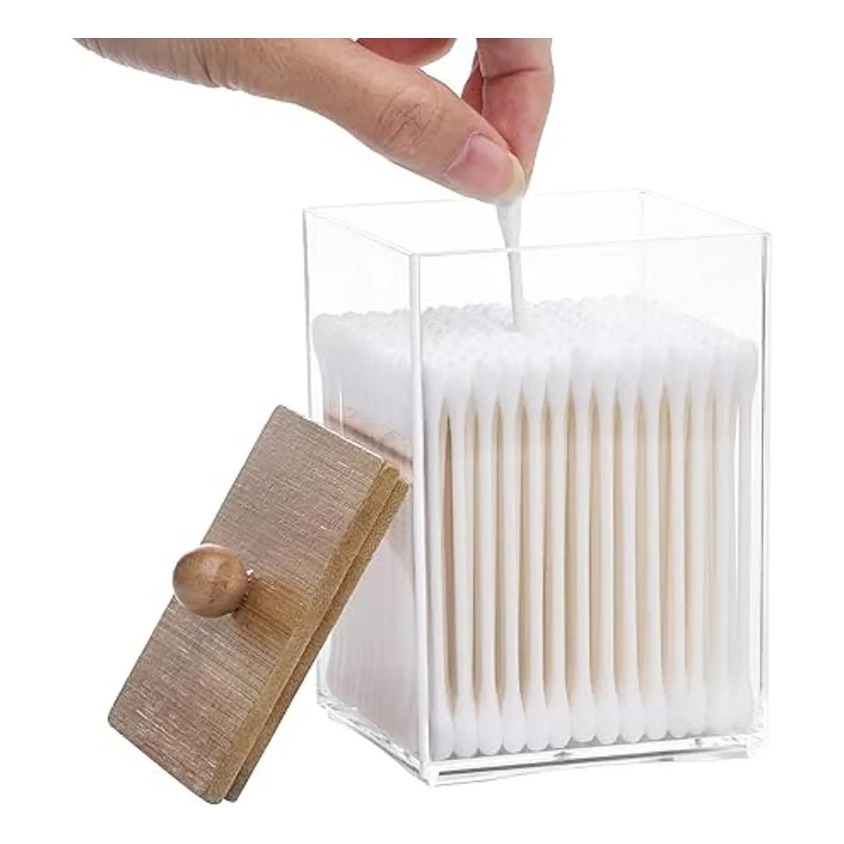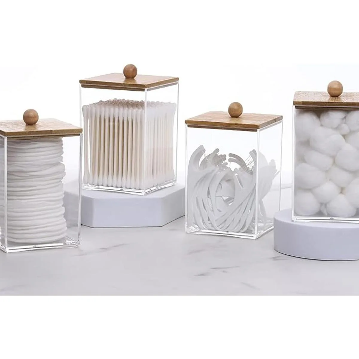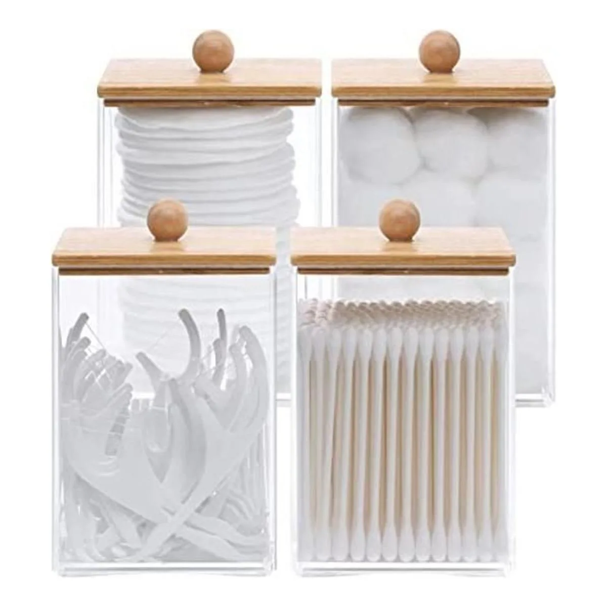 Tbestmax Soporte para hisopoboticario de algodón de 12 onzas, dispensador transparente de recipientes de baño para almacenamiento, paquete de 4 tapas de madera