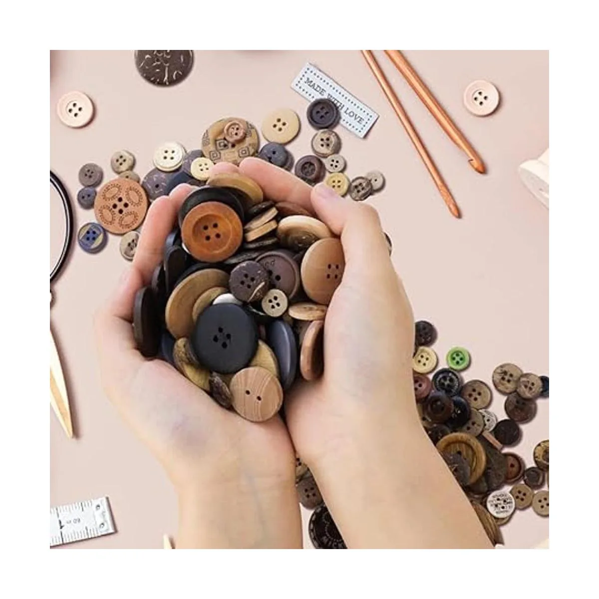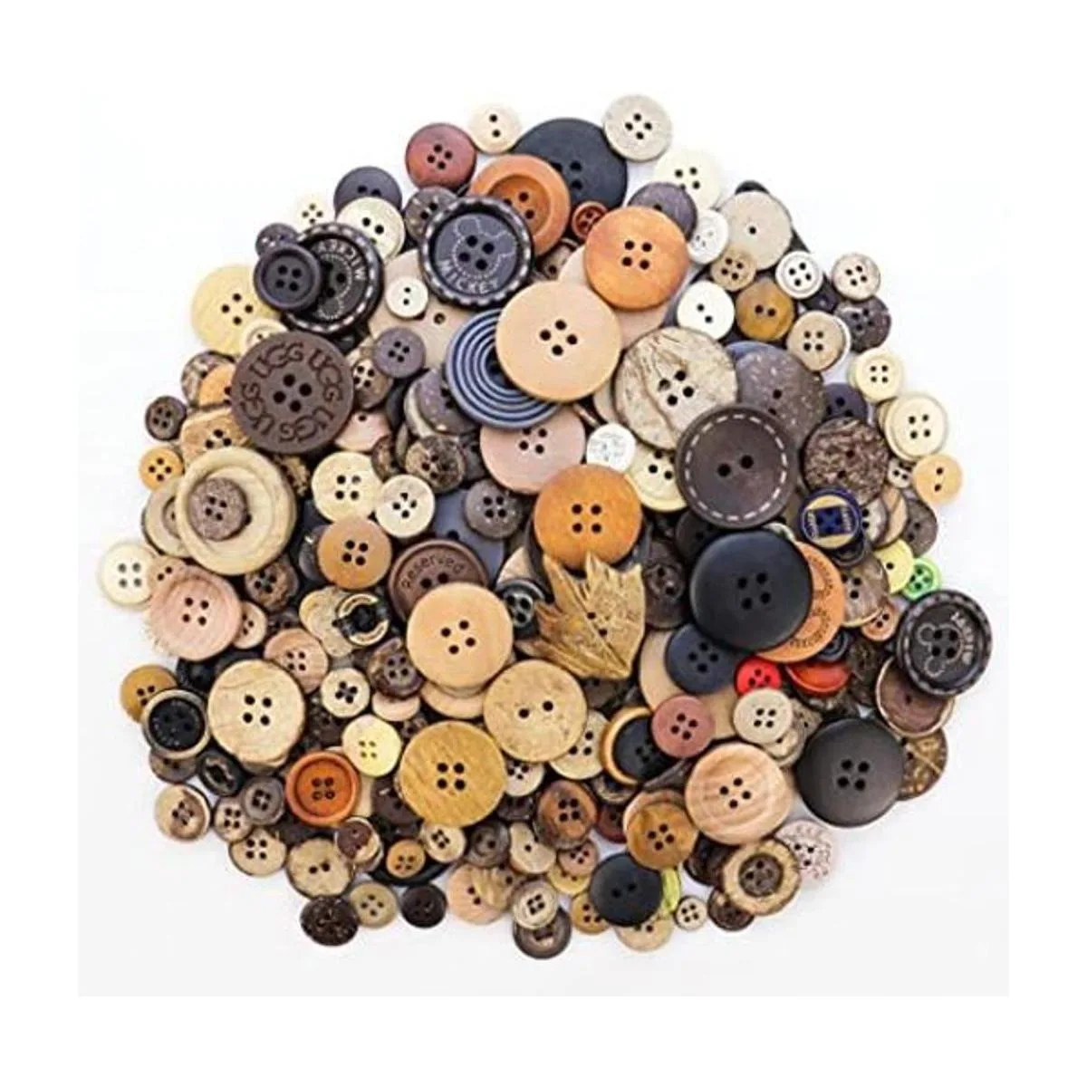 Paquete: cada paquete viene con aproximadamente 600 botones de madera, con varios tamaños y formas, algunos son botones redondos con 4 agujeros o 2 agujeros, algunos son botones de palanca de bocina con 2 agujeros.