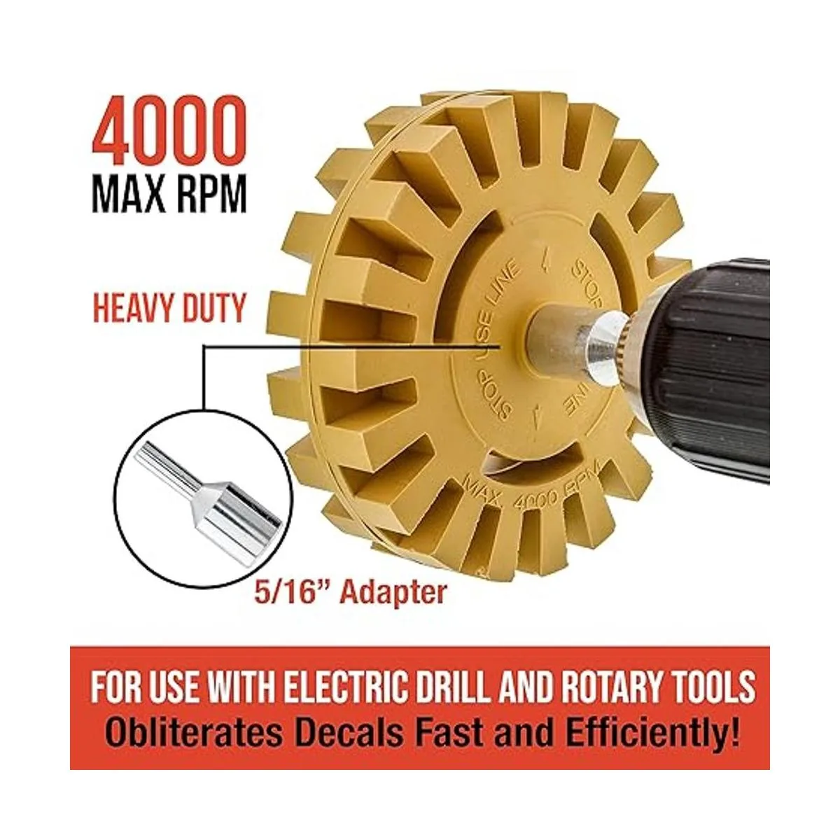 Calcomanías OBLITERATE: con el removedor de adhesivo TCP Global Rubber Eraser Wheel con adaptador, 1 paquete para quitar cualquier vinilo, calcomanía, gráfico, cinta de moldeado de doble cara, rayas y recortar en tu coche, camión o vehículo similar; 4 pulgadas 4.0 in de diámetro más grande que otros. ; Herramienta de fijación de taladro de densidad media de goma moldeada con una línea de uso de parada; para uso con taladro eléctrico con un máximo de 4.000 rpm mejores resultados entre 1.500 y 3.000 no para uso en revestimientos de laca.