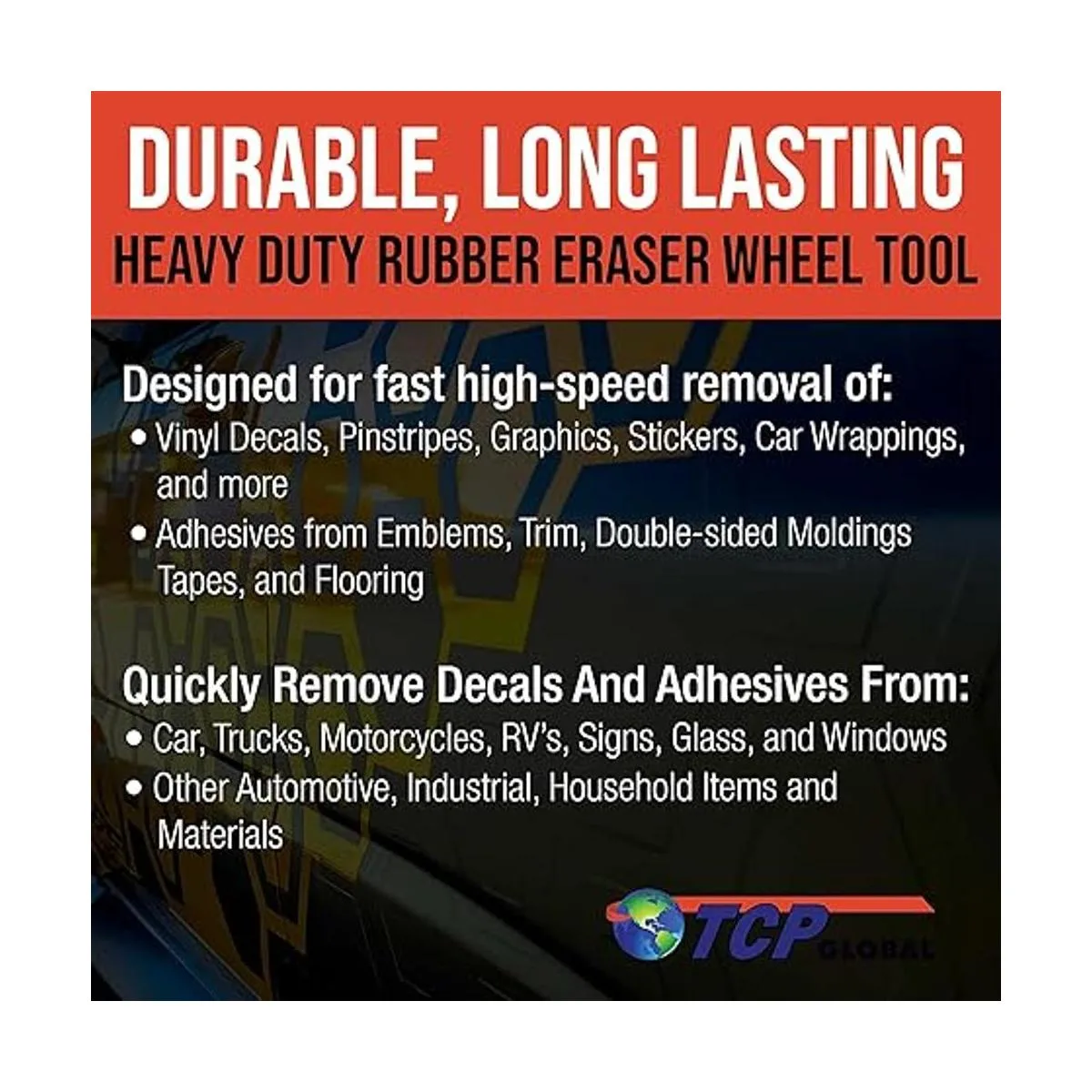 TCP Global Heavy Duty goma goma goma goma rueda 4 almohadilla adaptador Pinstripe, removedor adhesivo, calcomanía de vinilo, herramienta de eliminación de gráficos