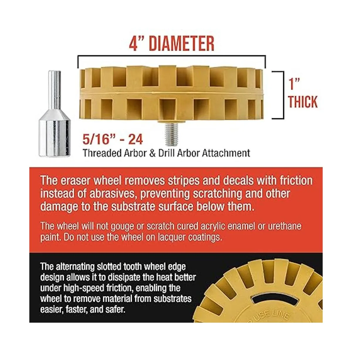 Seguro: no mancha ni raya el esmalte acrílico o la pintura de uretano; no hay necesidad de productos químicos peligrosos y dañinos; la rueda tiene una construcción duradera que soporta hasta 4.000 RPM; el hardware incluido de 5/16 24 hace que sea compatible con cualquier taladro estándar.