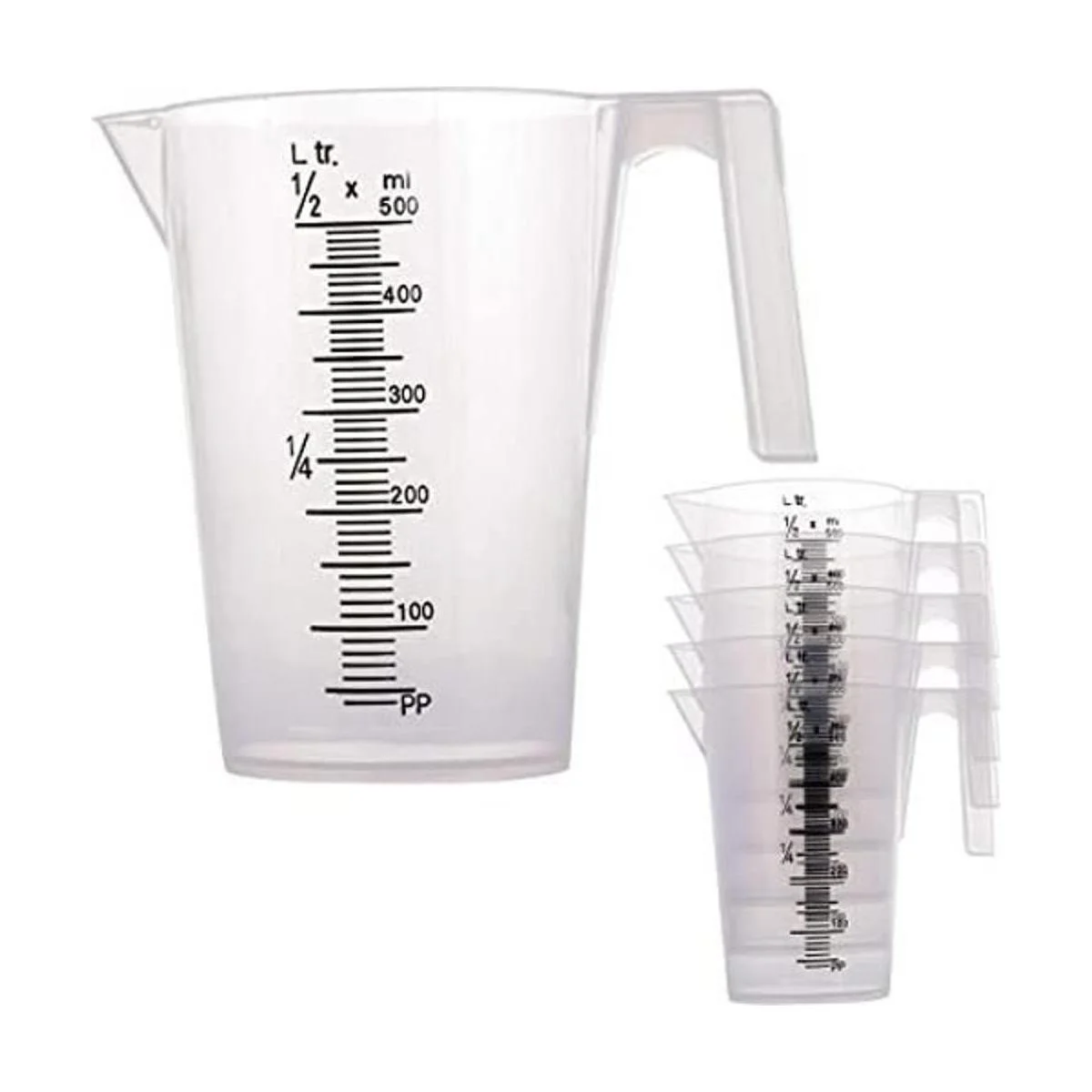 Prácticas jarras de medición transparentes que han elevado escalas de medición precisas graduadas impresas en ellos en litros métricos ltr y mililitros ml con intervalos graduados de 0.3 fl oz. Son ideales para uso general de laboratorio.
