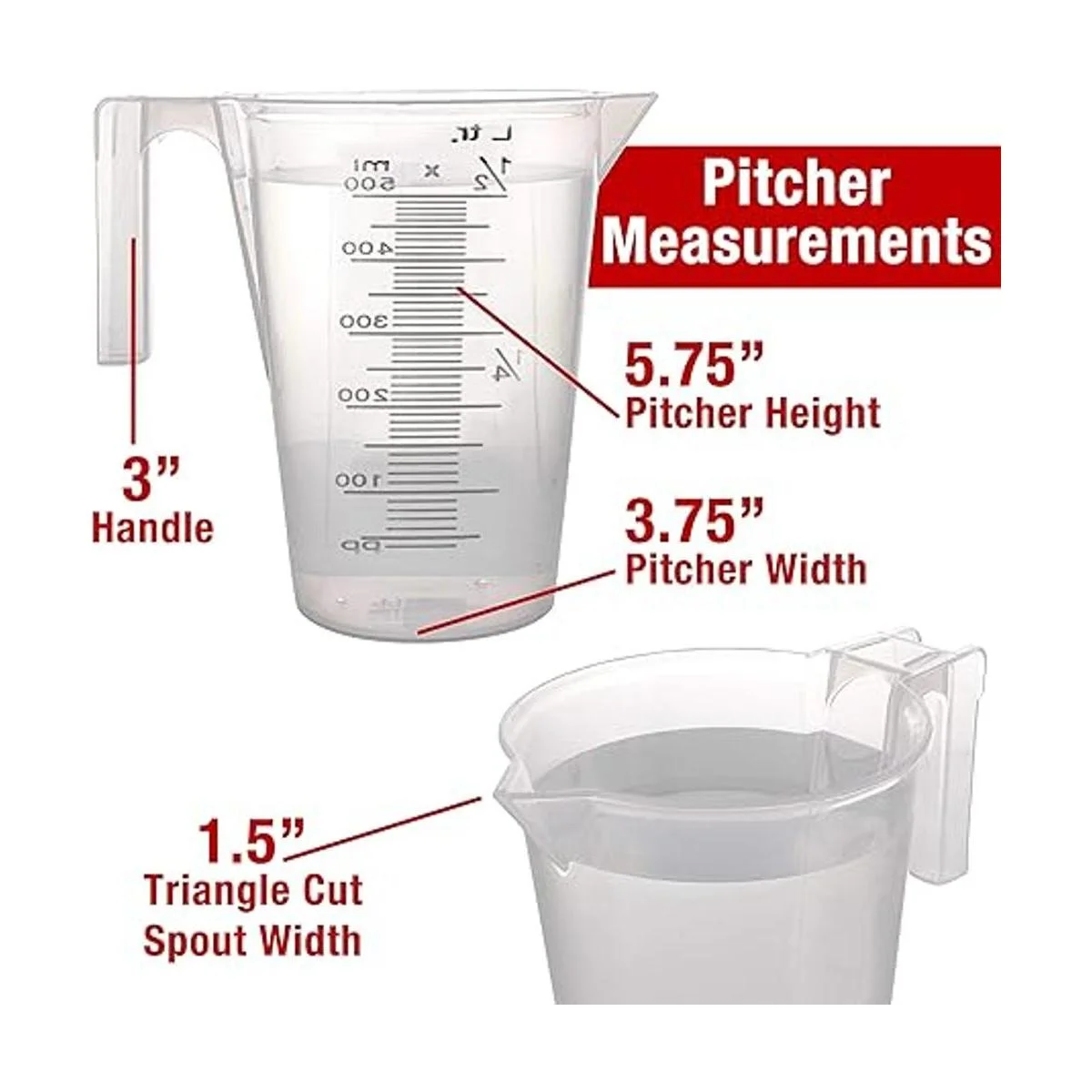 Paquete de 6 jarras de plástico resistente de 1/2 litro 16.9 fl oz. Cada jarra tiene capacidad para más de 1 pinta 16 onzas con una capacidad de 20 onzas líquidas. La jarra se apila y almacena fácilmente debido al diseño de la boquilla y las asas abiertas.