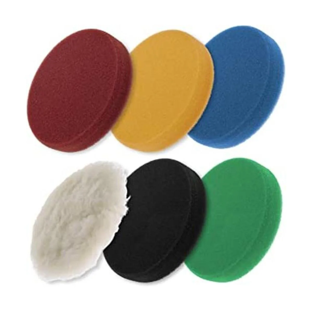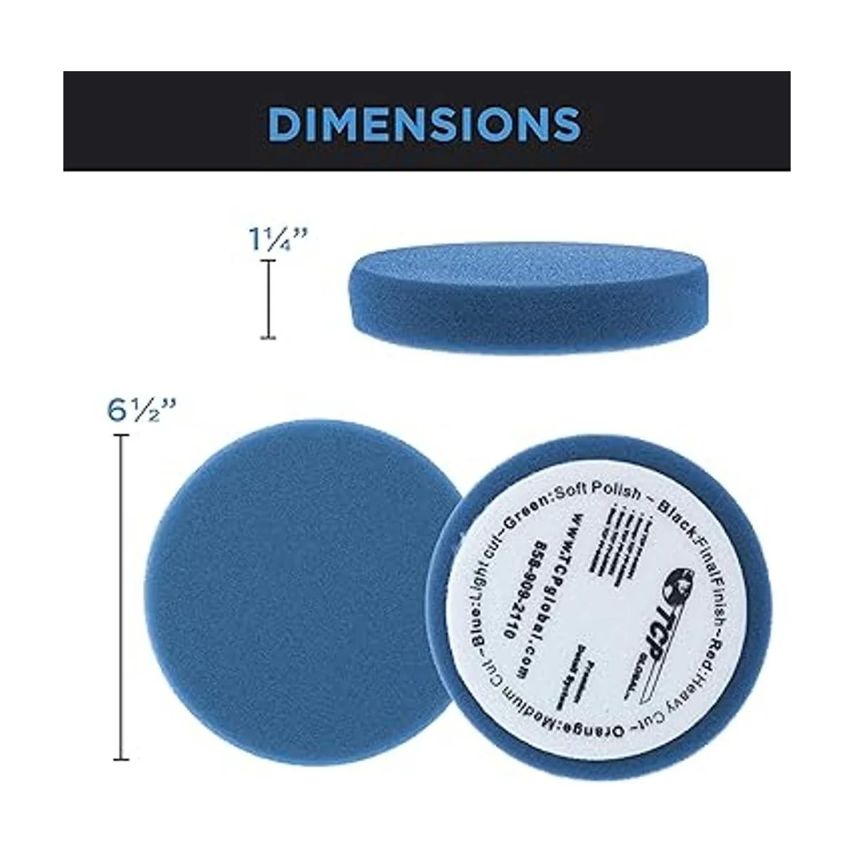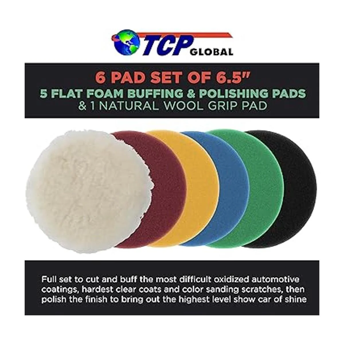 TCP Global Juego de almohadillas de doble acción de espuma plana de 6.5 pulgadas, 5 niveles de almohadillas de espuma y 1 almohadilla de agarre de lana natural, marca de alto rendimiento, pintura para automóviles de pulido, pulido y detalle, capa de gel para barcos, almohadillas pulidoras de fibra de vidrio