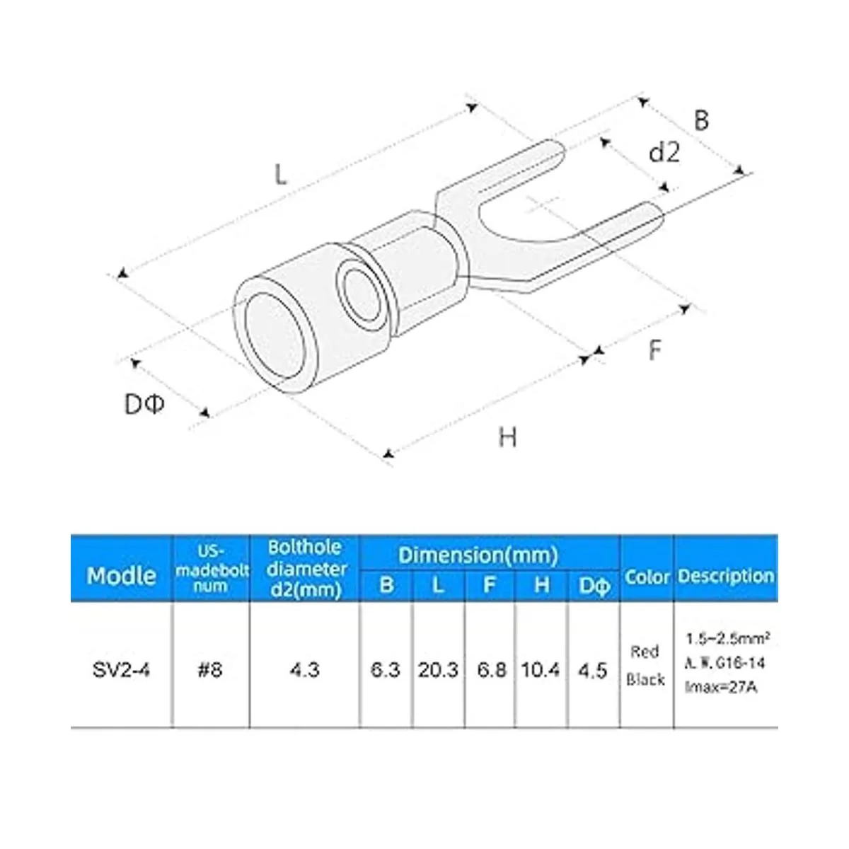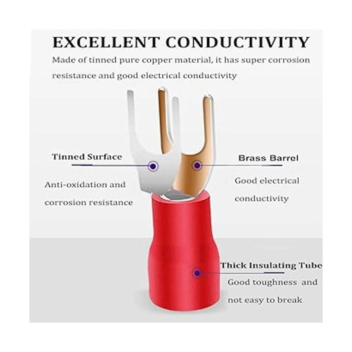 El paquete incluye: recibirás 200 conectores de alambre de horquilla aislados de 16 a 14 AWG 100 piezas rojas 100 piezas negras. Puedes utilizar rojo y negro como electrodos positivos y negativos respectivamente.