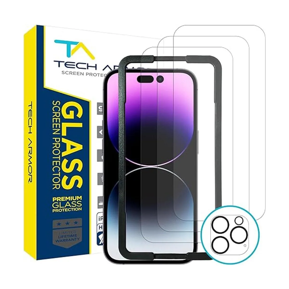 Tech Armor Paquete de 3 protectores de pantalla diseñados para iPhone 14 Pro 5G 6.1 pulgadas Pantalla 2022 con 1 protector de lente de cámara de vidrio templado, dureza 9H, transparente HD