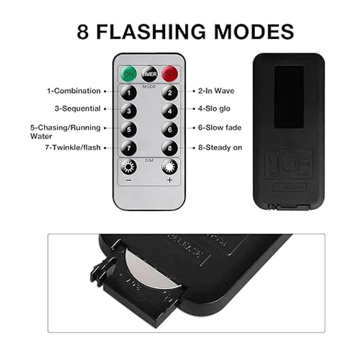 8 modos de luces colgantes con control remoto: hay 4 luces de hadas con 4 controles remotos, rango de recepción eficaz de 10 a 49.2 ft. Soporta control remoto de rango para controlar 8 modos diferentes combinación, en onda, secuencial, brillo lento, persecución/flash, desvanecimiento lento, parpadeo/flash, encendido constante. Para evitar olvidar apagar las luces de cadena, puedes ajustar el temporizador pulsando el botón de temporizador, el temporizador, el temporizador. ed luces de hadas pueden ser se enciende automáticamente durante 6 horas y se apaga durante 18 horas.
