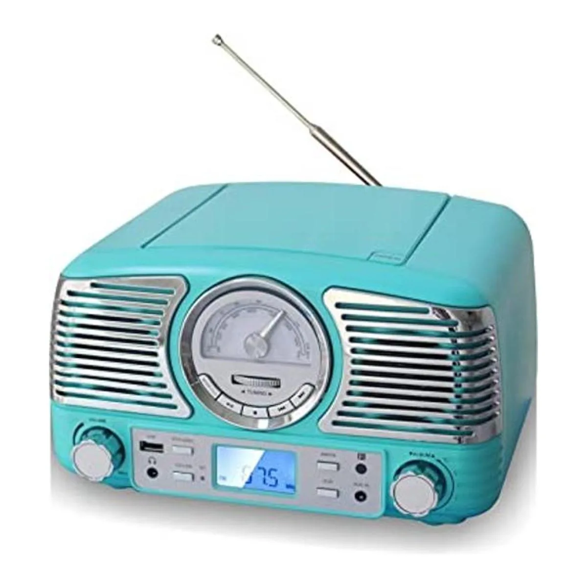 TechPlay QT62BT, CD estéreo compacto de diseño retro, con perilla giratoria AMFM, recepción inalámbrica Bluetooth y puerto USB. Con entrada auxiliar y conector de auriculares Turqouise