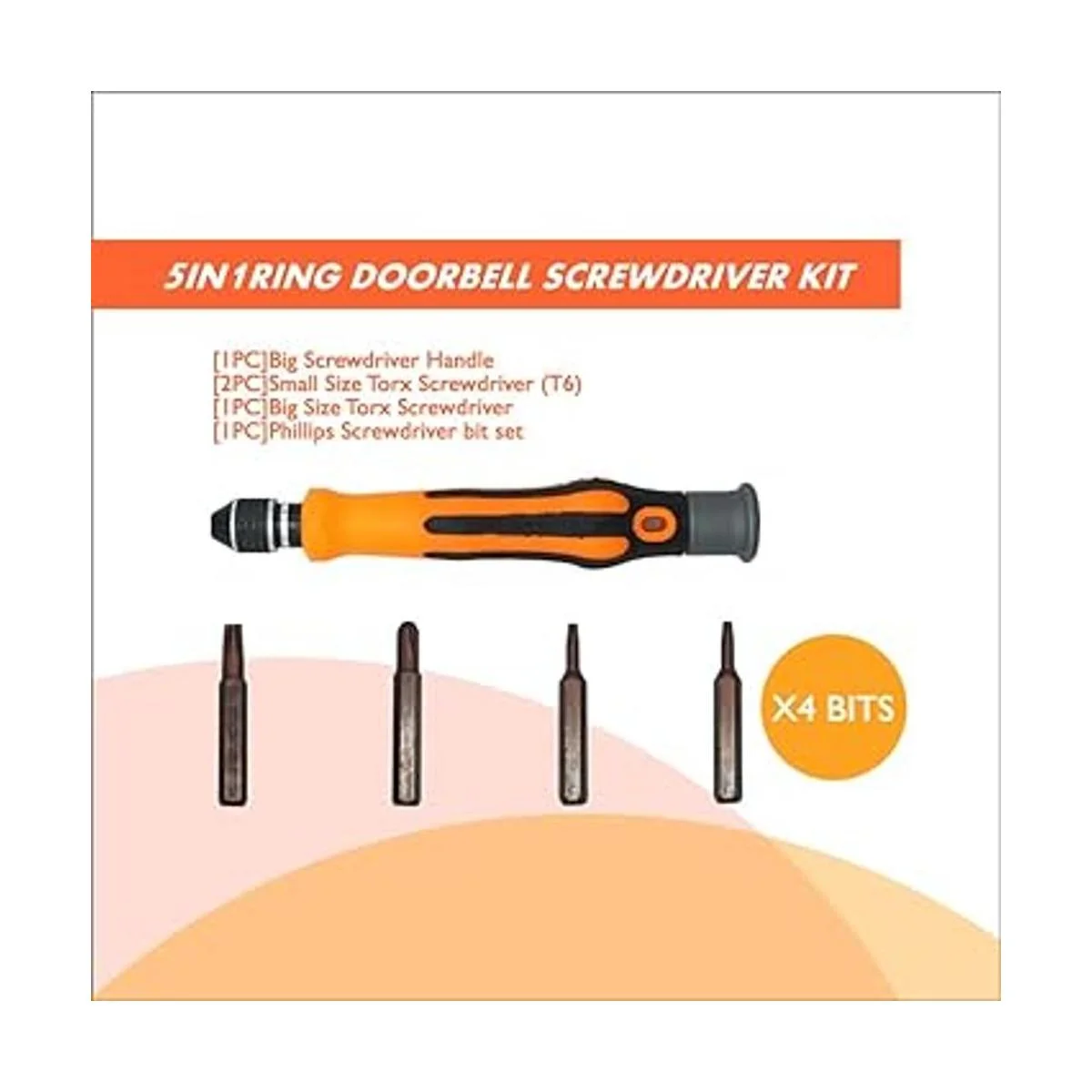 Brocas Torx dobles T6: este juego de destornilladores de timbre 5 en 1 incluye 2 puntas de destornillador Torx T6, el destornillador T6 se utiliza para timbre Ring 1 y ponemos 2 piezas T6 en caso de que recibas una pelada y no puedas terminar tu trabajo. Este kit también incluye una broca de destornillador Torx de tamaño más grande que es para timbre Ring 2 y timbre de anillo nuevo. También incluye una broca de destornillador Phillips.
