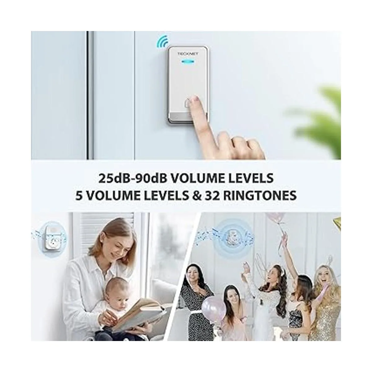 TECKNET Timbre de puerta inalámbrico, timbre autoalimentado, no requiere batería, botón pulsador enchufable, campanilla de puerta inalámbrica, alcance de hasta 1300 pies con 32 campanas, volumen de 5 niveles y luz LED blanco