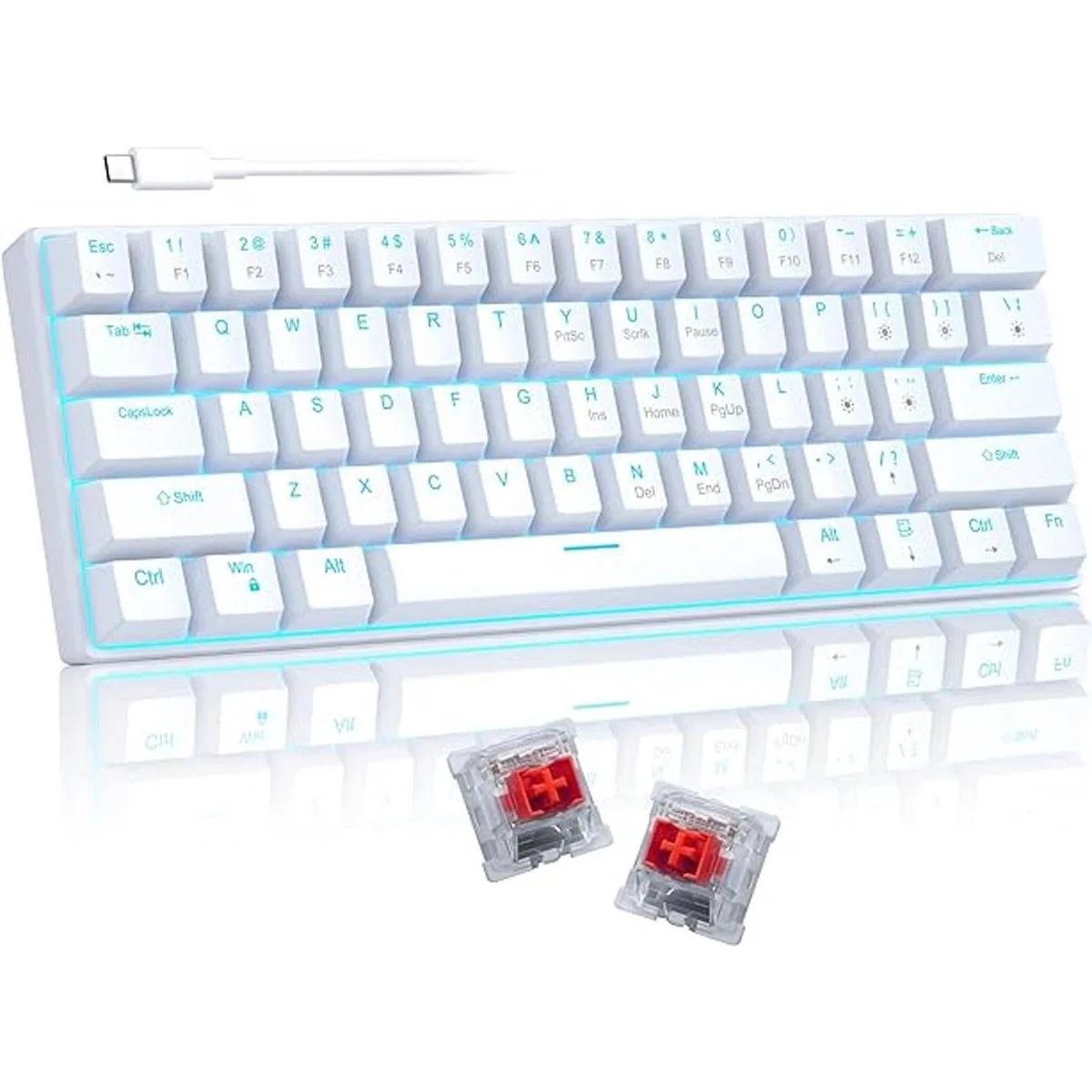 Teclado 60 mecánico para juegos, teclado blanco para juegos con interruptores rojos, cable desmontable tipo C 60 mini teclado con luz azul polvo para Windows Mac PC computadora portátil.
