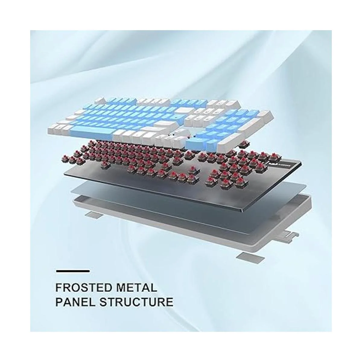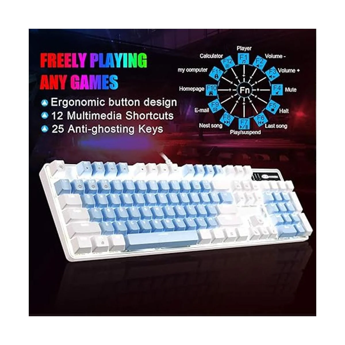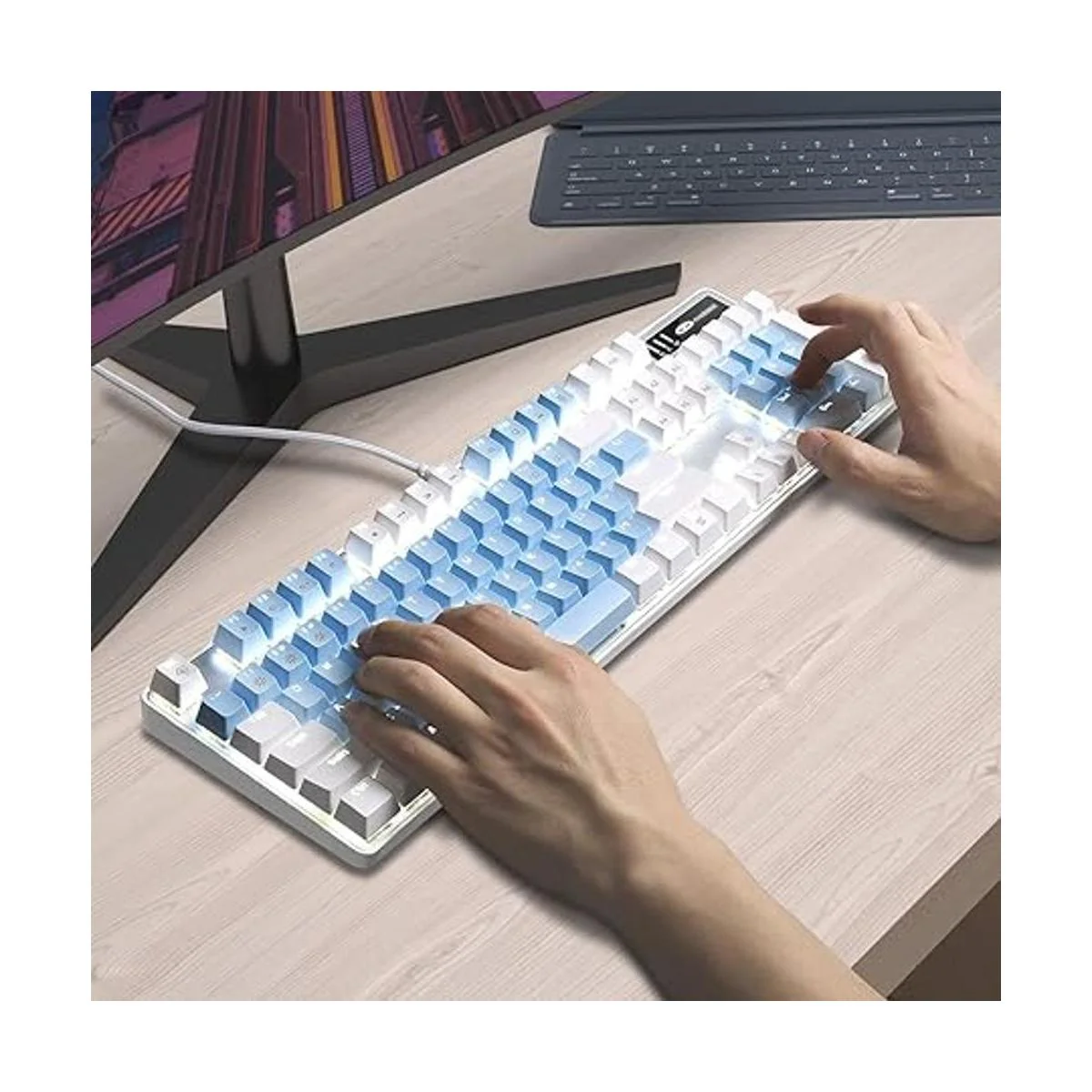 Teclado mecánico para juegos, 104 teclas, teclados mecánicos retroiluminados blancos con interruptores rojos y teclas de doble tiro, teclado ergonómico con cable MageGee para computadora de escritorio, jugadores de PC blanco y azul