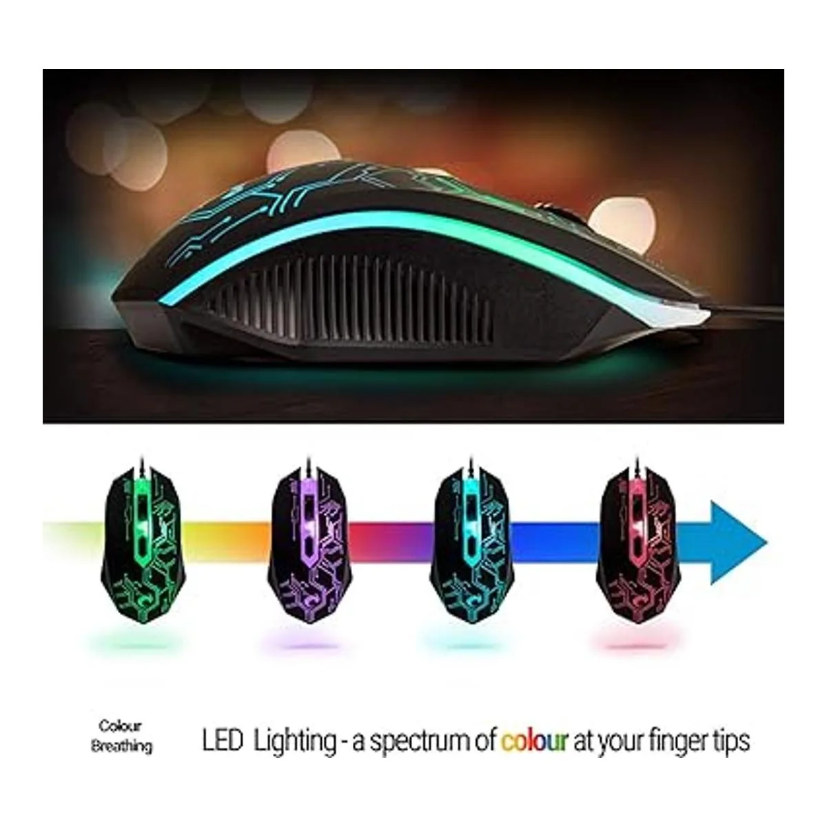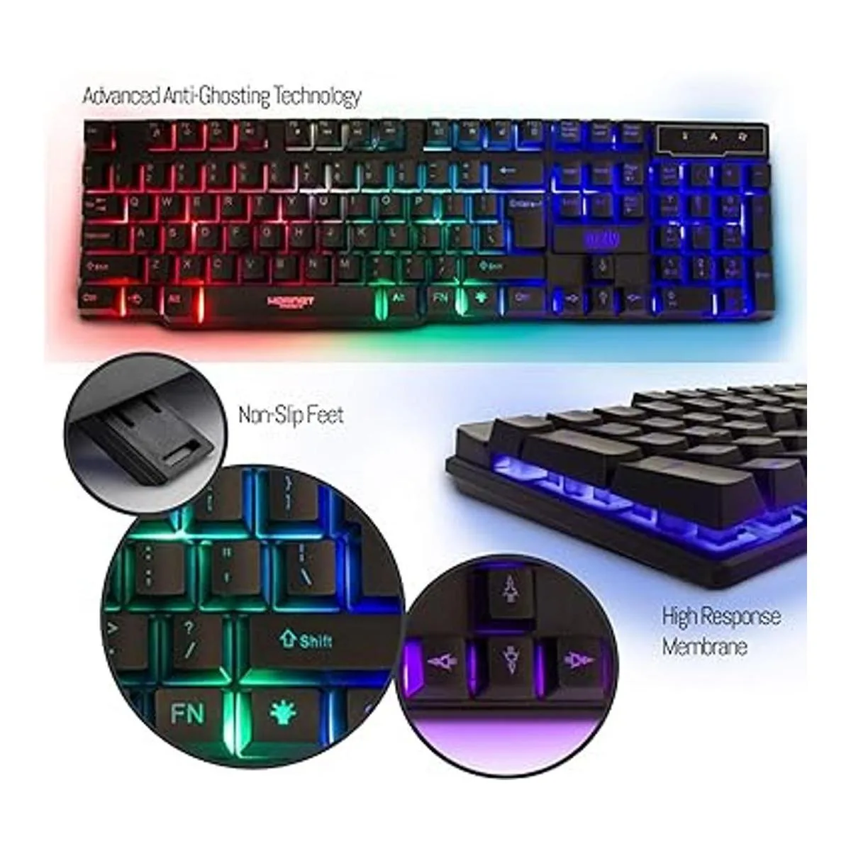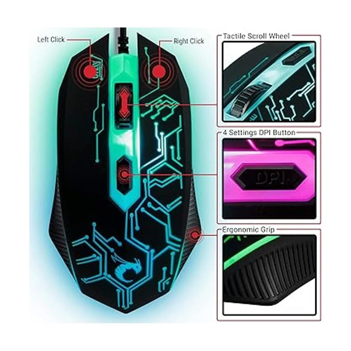 El teclado y el mouse para juegos vienen con 3 colores giratorios y modo de respiración, 4 colores circulares LED mouse para juegos, 4 DPI ajustables 1200, 1600, 2400, 3200. Teclado para juegos de membrana con cable con retroiluminación LED multicolor, antifantasma con rollover de 19 teclas, pulsaciones de teclas suaves que permiten una acción rápida en silencio, teclas de control multimedia, teclas de función de modo de juego y patas ajustables para comodidad en la muñeca