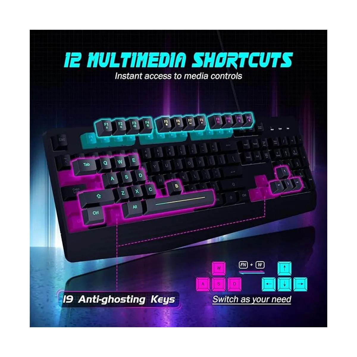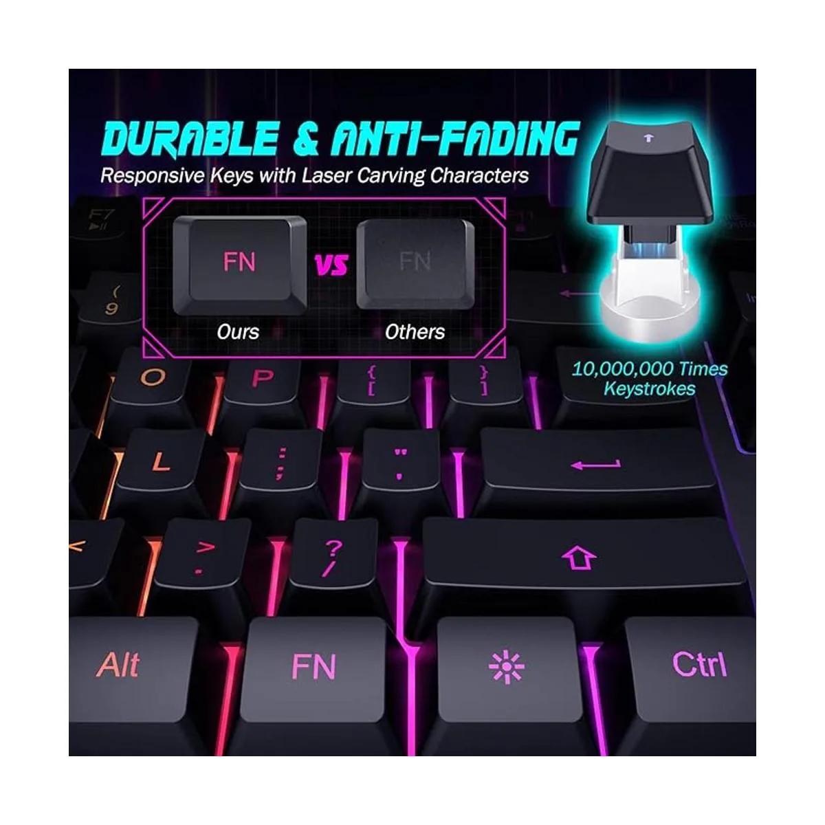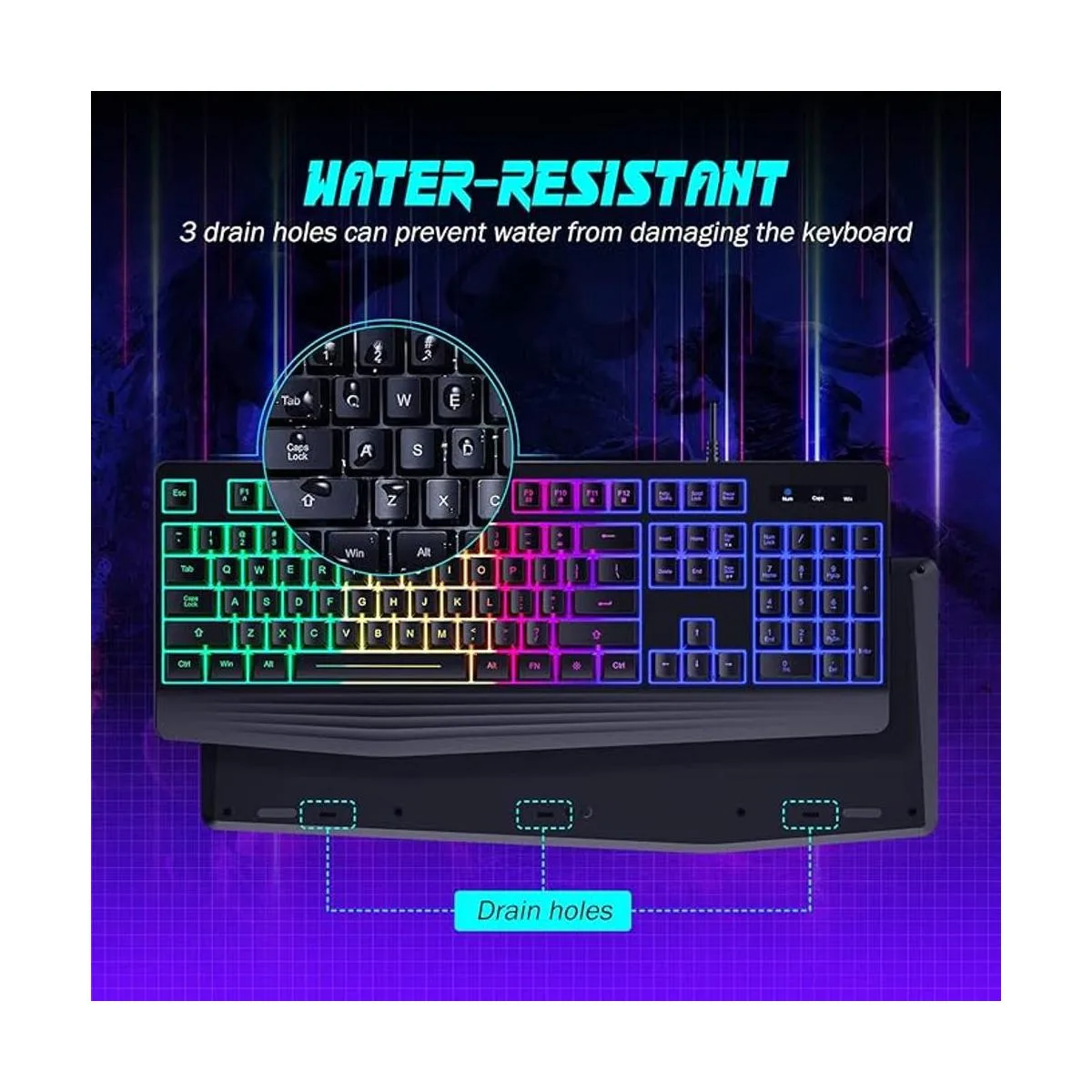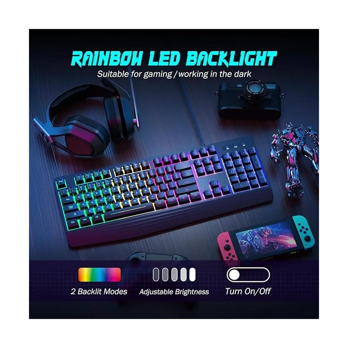 Teclado para juegos, retroiluminación LED arcoíris de 7 colores, teclado silencioso de 104 teclas con reposamuñecas, teclas multimedia, silenciosas, 19 teclas antifantasma, teclado USB de oficina impermeable para PC, Mac Xbox