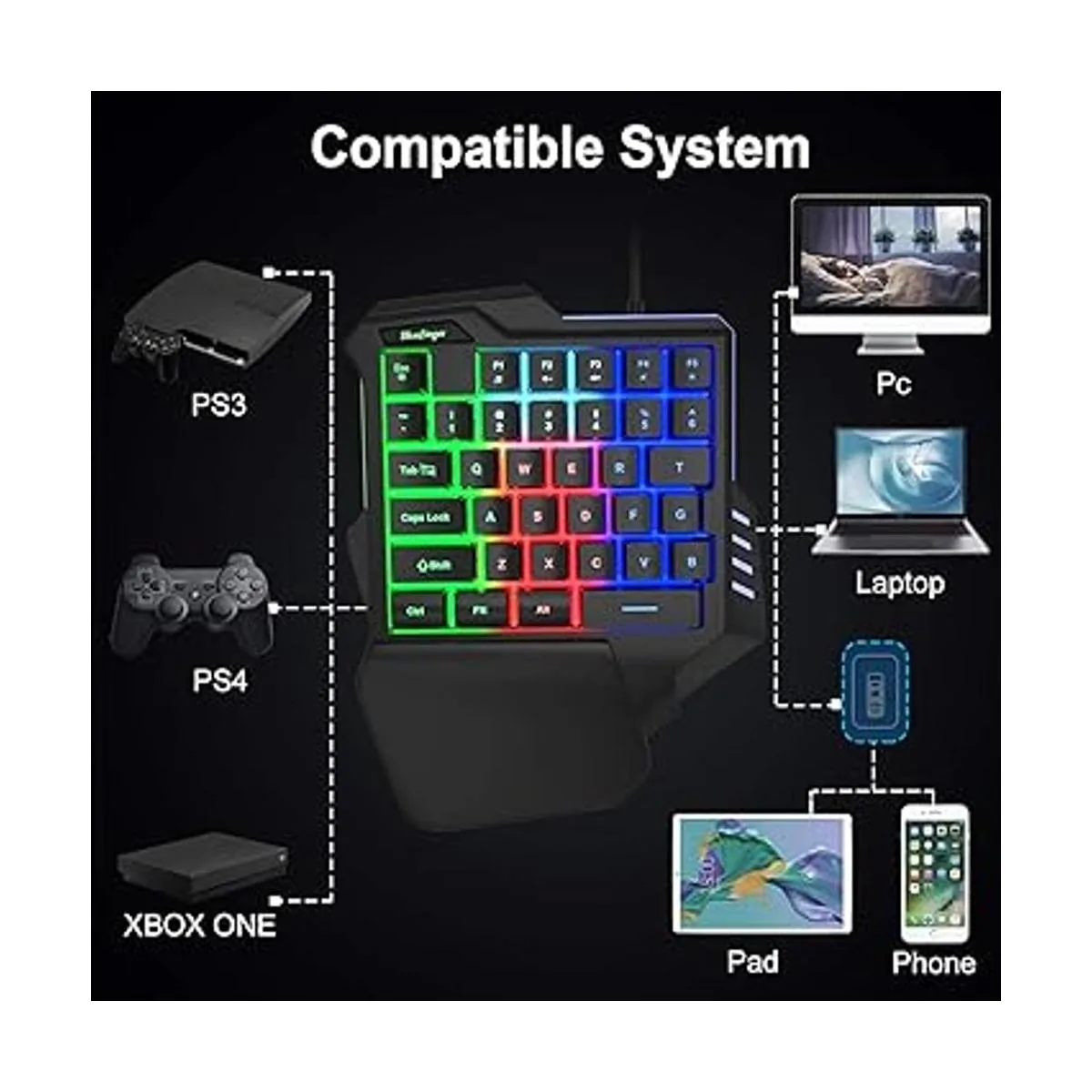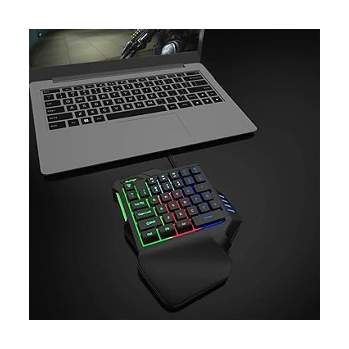 Teclado RGB para juegos de una mano, USB con cable Rainbow Letras Glow Teclado de una sola mano con soporte para reposamuñecas teclas multimedia, teclado ergonómico retroiluminado con sensación mecánica para el juego