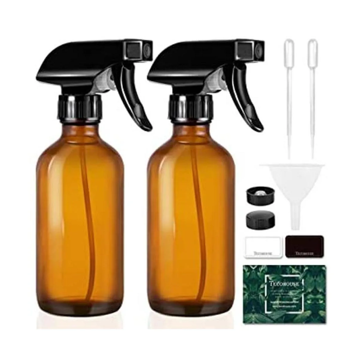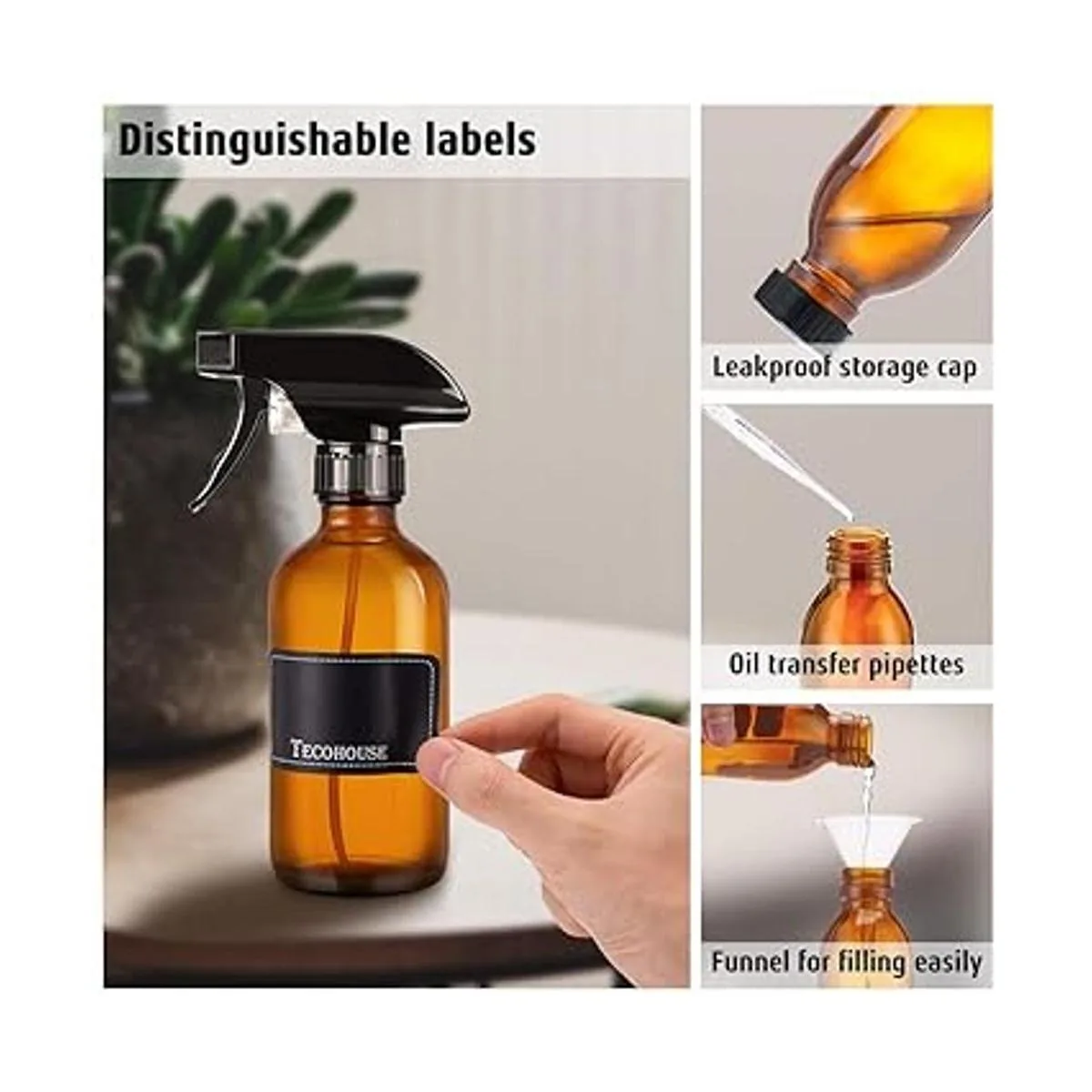 Tecohouse Botella de espray de vidrio de 8 onzas para productos de limpieza y aceite esencial, recipiente rociador recargable vacío ámbar con etiquetas, embudo, tapas, pipetas graduadas, tamaño de mano
