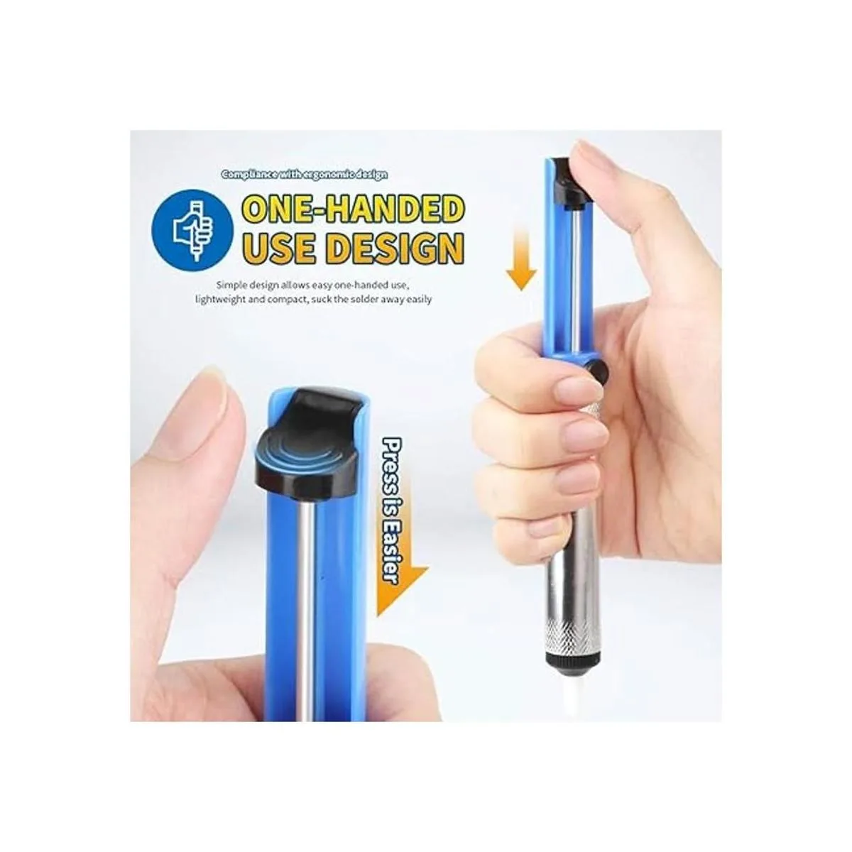 Diseño simple que permite un uso fácil con una sola mano, ligero y compacto, succiona la soldadura fácilmente.