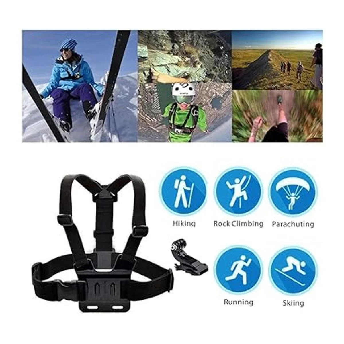 Soporte de arnés de correa de pecho ajustable : te permite llevar la cámara de acción en tu pecho. Diseño cómodo y totalmente ajustable que se adapta a todas las formas y tamaños, ideal para grabar rápidamente sobre la marcha.