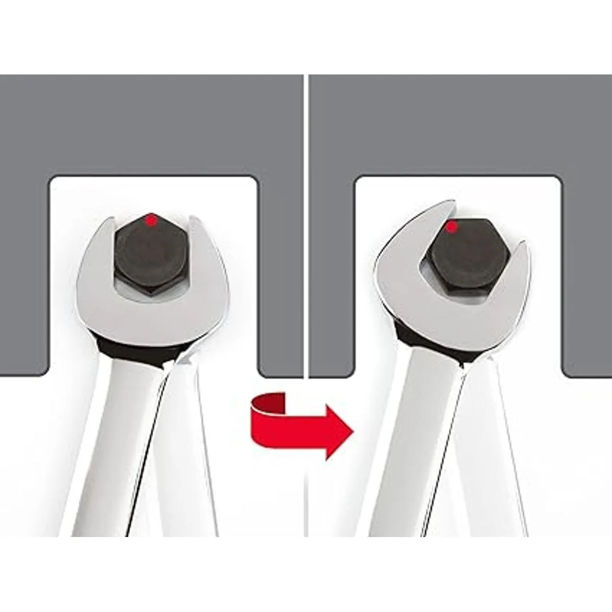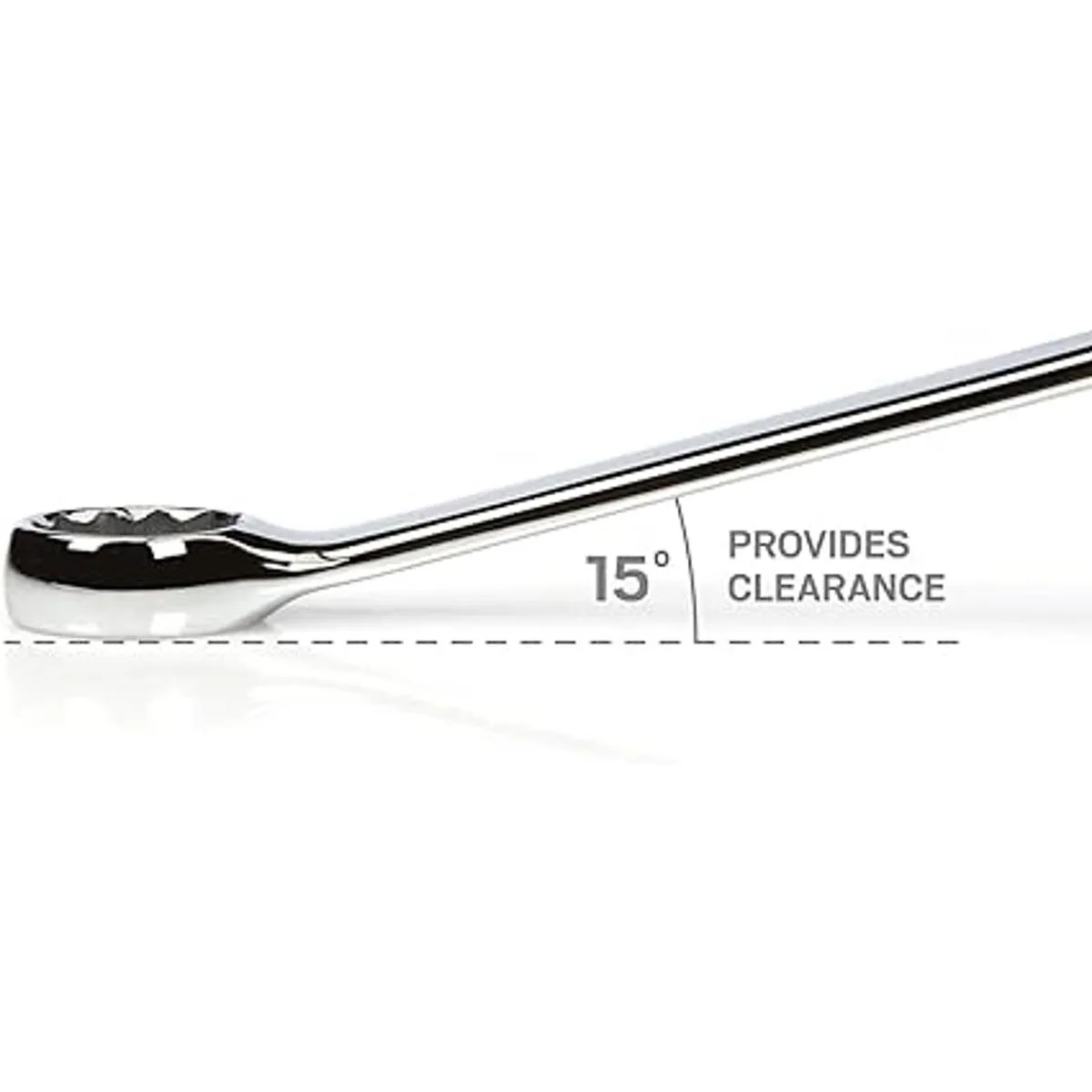 Open end is angled 15 degrees so the wrench can be flipped over to engage fasteners twice as often in tight spaces