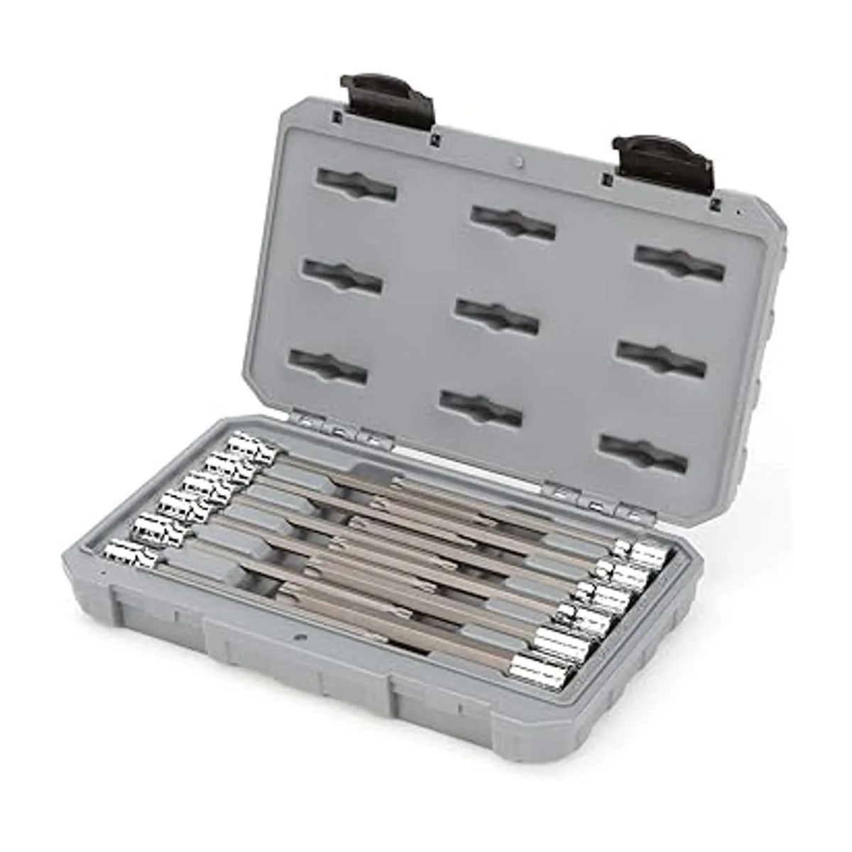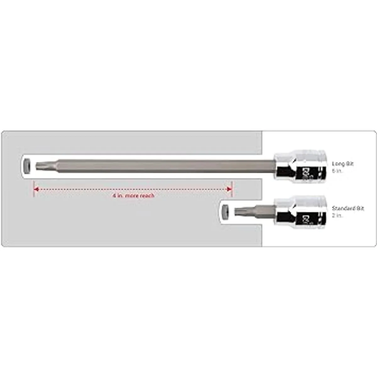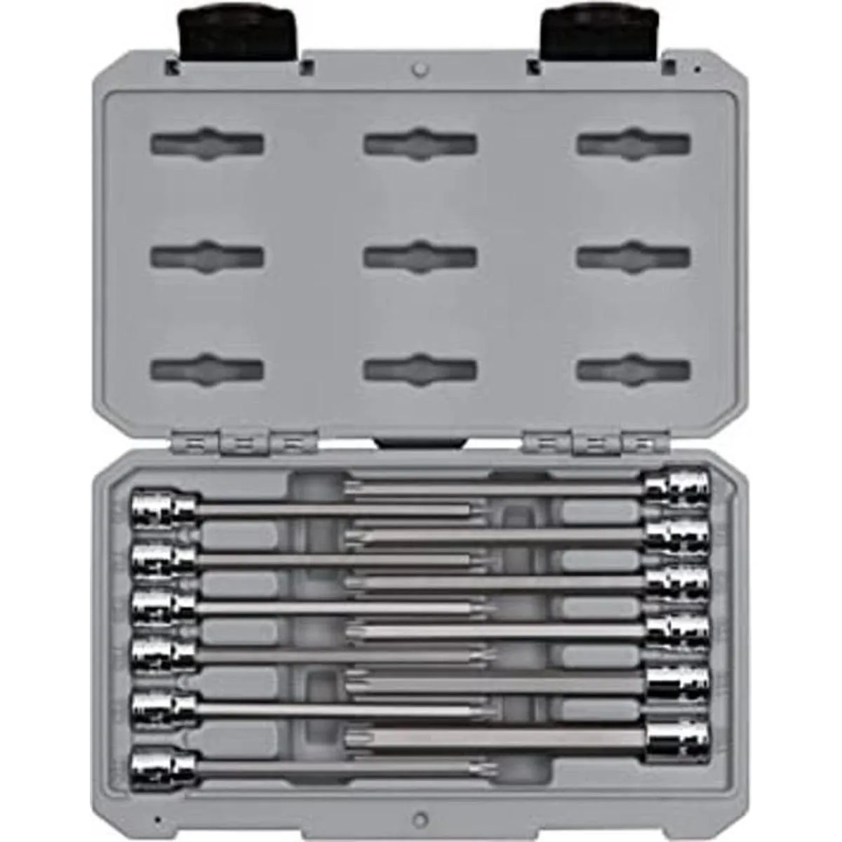 Incluye 12 unidades. 3/8 pulg Casquillos largos Torx: T10, T15, T20, T25, T27, T30, T40, T45, T47, T50, T55, T60; caja de almacenamiento