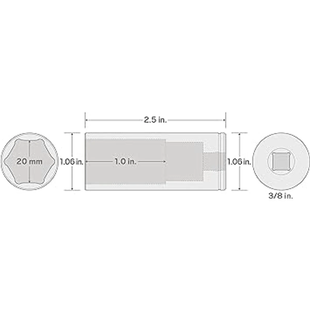 Longitud total del enchufe: 2.5 pulgadas. Diámetro del extremo del enchufe: 1 pulgada. Diámetro del extremo de la transmisión: 1 pulgada. Profundidad del pozo del enchufe: 1 pulgada.