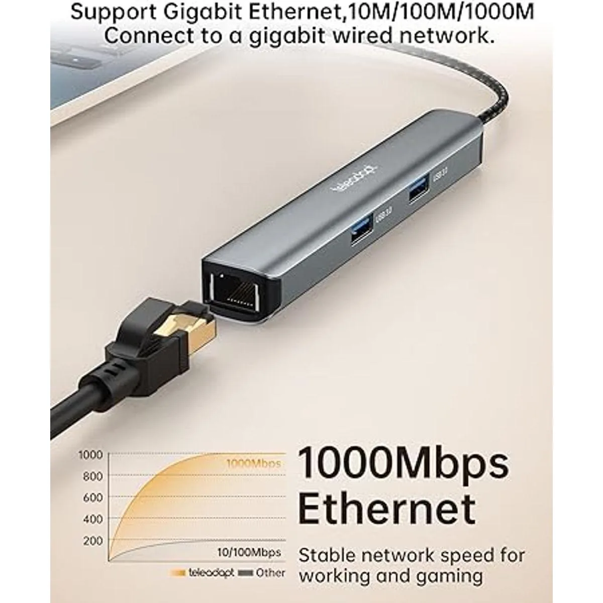 Teleadapt Hub USB tipo C 6 en 1. HDMI 4K, Ethernet de 1 Gbps, puerto de datos USB tipo C, puerto de entrega de energía USB tipo C no datos, 2 puertos de datos USB 3.0 de 5 Gbps. Ideal para MacBook ProAir, iPad Pro, Dell XPS