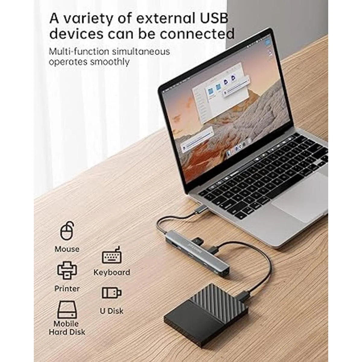 Diseño 6 en 1: hub USB tipo C 6 en 1 con HDMI, 2 USBA, RJ45, datos USB tipo C y puertos USB tipo C PD hembra. Proporciona una solución ideal para añadir puertos a un host USB tipo C o Thunderbolt 3 PC/portátil/teléfono móvil, etc..