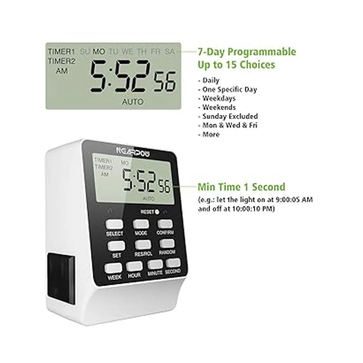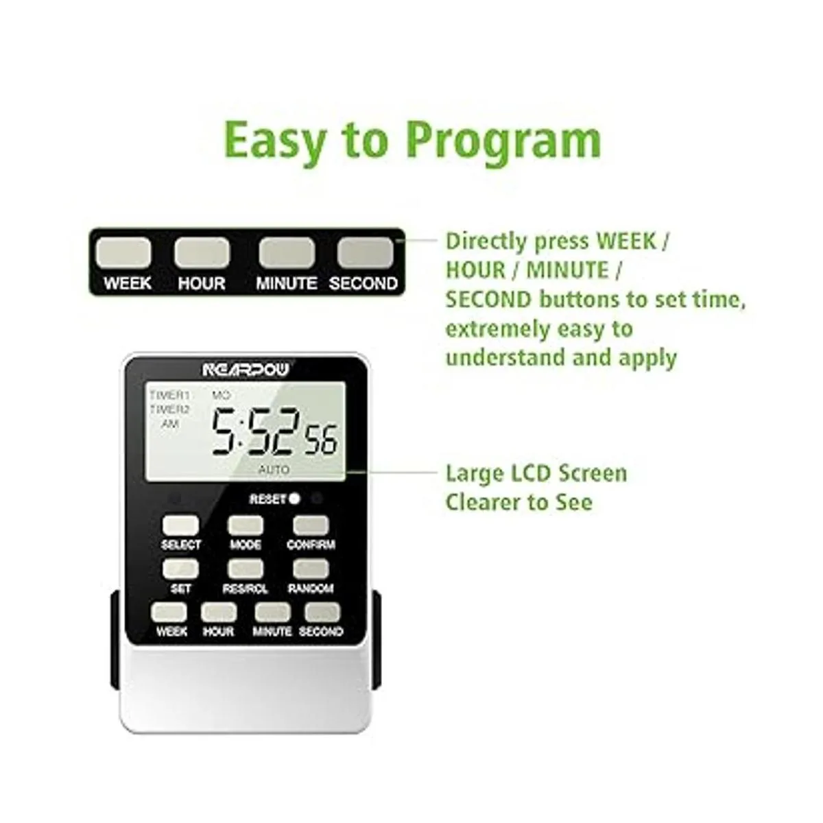 Fácil de programar: este temporizador de luz digital permite un ajuste de tiempo extremadamente cómodo y flexible para semana, hora, minuto y segundo directamente, súper fácil de entender y aplicar, satisface completamente tus necesidades. Y el tiempo de ajuste mínimo es tan preciso como 1 segundo